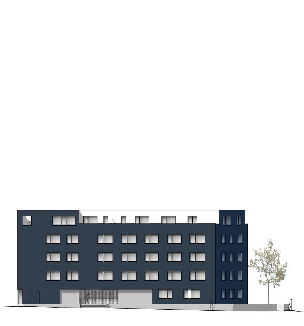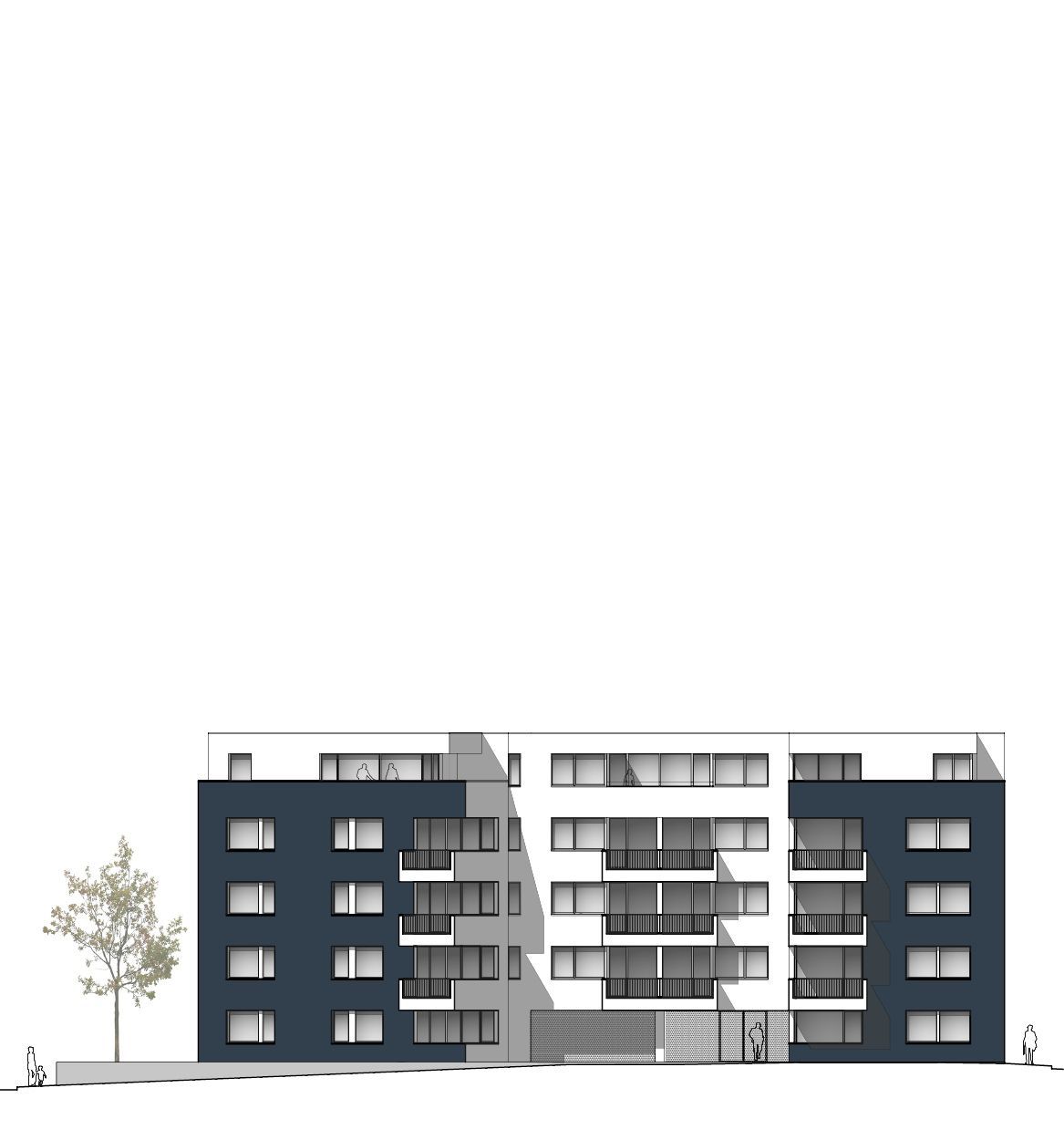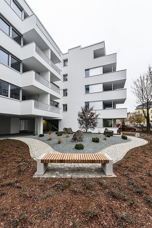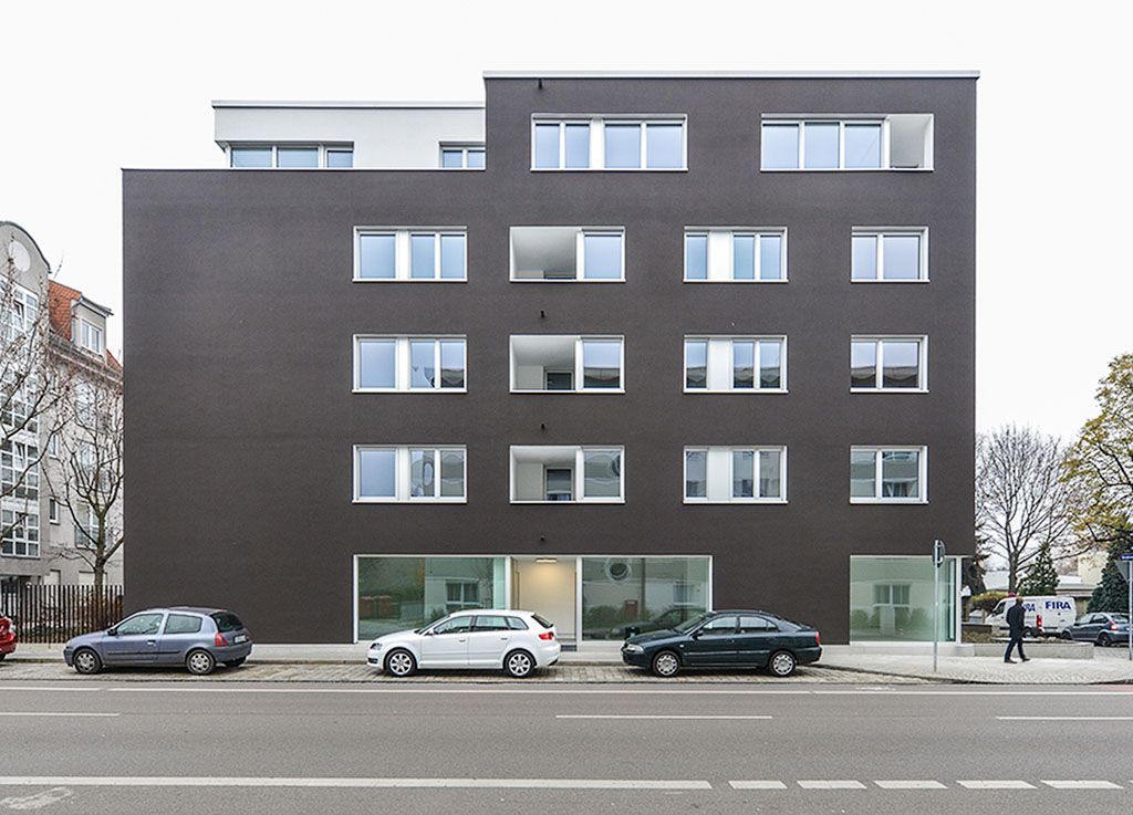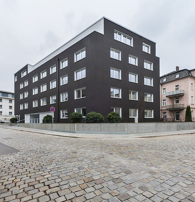 Das Grundstück im Stadtteil Dresden-Löbtau ist dreiseitig von Straßen umfasst. Aus dieser städtebaulichen Situation leitet sich die Charakteristik des Baukörpers als quartierschließende U-Form ab. Der Leitgedanke „form follows function“ wird zu „function follows form“ gewandelt. Die U-Form ermöglicht allen Bewohnern gleiche, optimale Wohnbedingungen. Gewohnt wird in den geschützten, lichtdurchfluteten Innenhof, geschlafen zu den nachts lärmarmen Straßen.Der als Skulptur verstandene Baukörper reagiert durch bewusst eingesetzte Architektur selbstverständlich auf seine Umgebung. Überhöhung, subtraktive Bereiche, auskragende Balkonzonen und ins Gebäude hineinführende Loggien setzen Betonungen bzw. ermöglichen eine angemessene Überleitung zu angrenzenden Situationen wie Straßen oder Nachbargebäuden. Als Ziel sollte ein Baukörper geformt werden, der die städtebauliche Struktur im Quartier nachhaltig stärkt, die architektonische Qualität des Viertels positiv beeinflusst und Bewohnern Raum für nachhaltige Lebensqualität bietet. Erlebt man den Ort heute, findet man diesen Anspruch als gebaute Realität wieder. Beginnend bei dem großzügigen, zwischen Straße und Hof hindurchgesteckten Eingang, ermöglicht das Gebäude aus allen Blickwinkeln neue und spannende Perspektiven. Expressive Zonen stehen im Spannungsfeld zu intimen Bereichen. Das farbliche Konzept rahmt die bauliche Substanz. Zur Straße wurde bewusst eine sehr dunkle Farbgebung gewählt. Die dunkle Tönung scheint Lärm und Schmutz zu absorbieren. Ausgeschnittene Bereiche, wie Innenhof, Staffeln oder Loggien erhielten eine weiße Oberfläche, welche das Licht verstärkt.