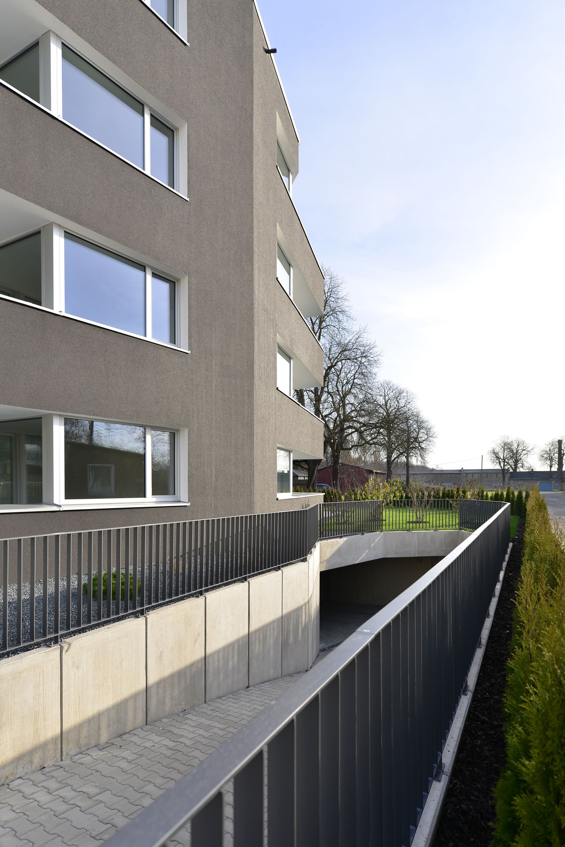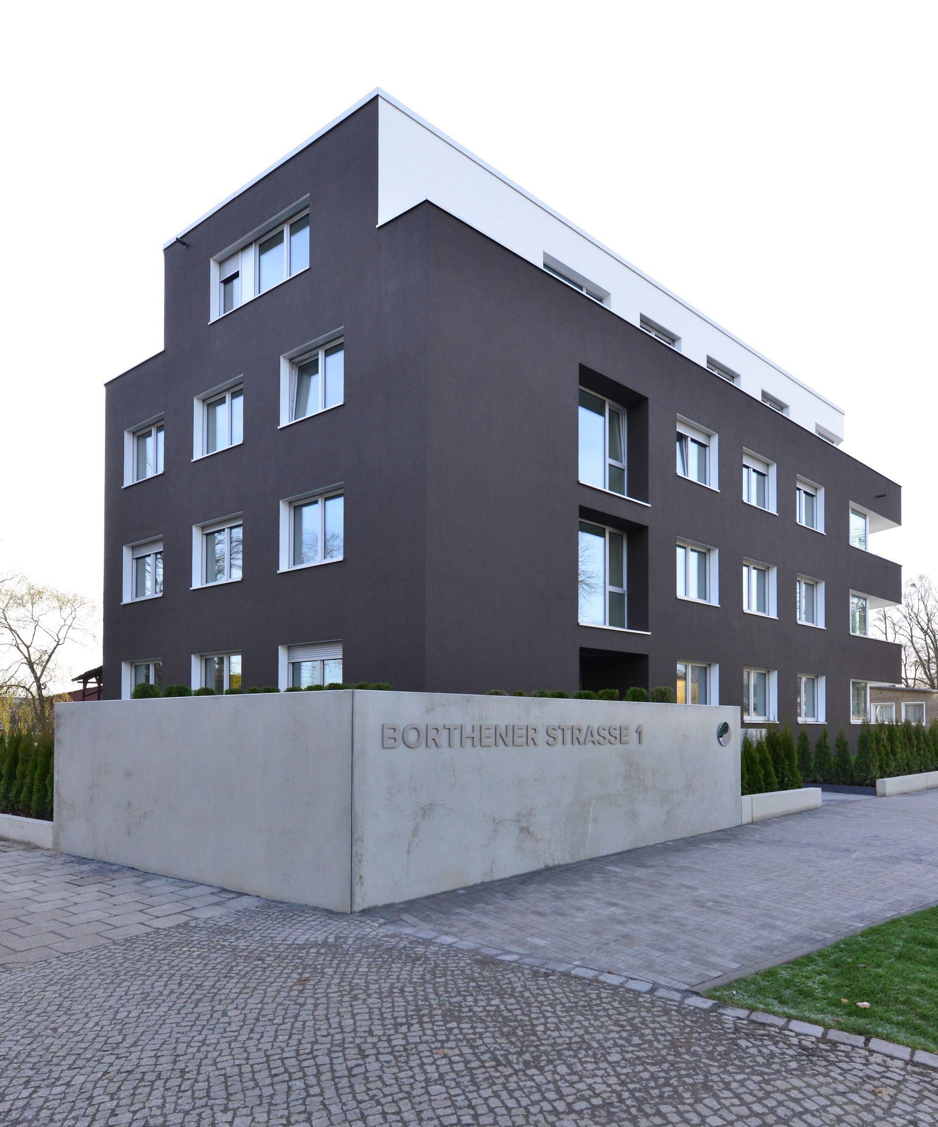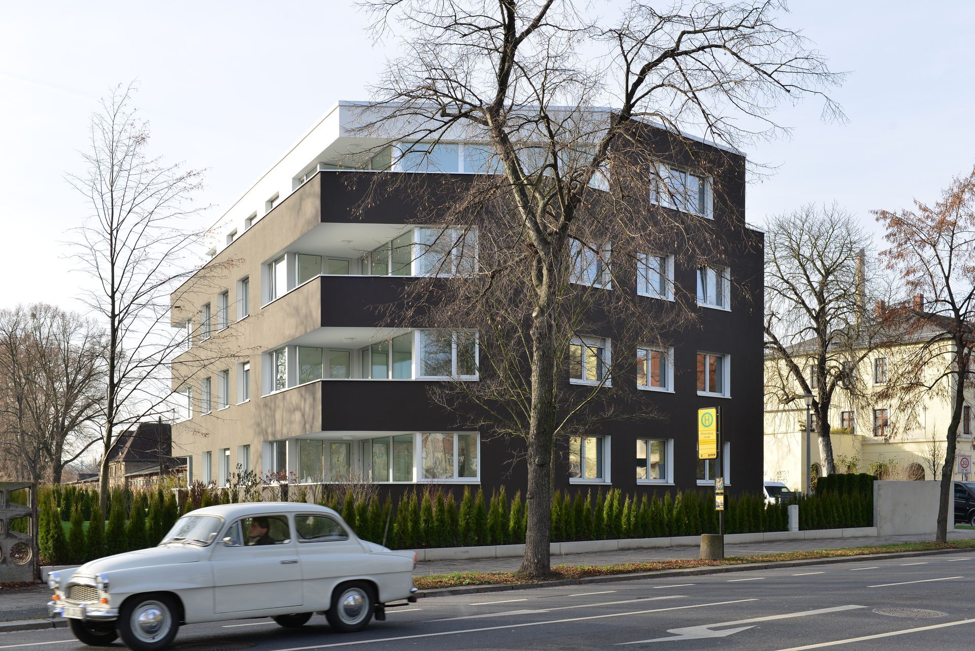 Infolge des Strukturwandels im Pferderennsport stehen im Areal der Galopprennbahn ehemalige Wirtschaftsflächen vor der Umwandlung zu einem attraktiven, zeitgemäßen Wohnquartier. Umgeben von mehreren Ensemblebebauungen aus unterschiedlichen Epochen des letzten Jahrhunderts, lag die Bebauung des Areals mit einem Mix aus freistehendem und blockrandschließendem Geschosswohnungsbau nahe. Der Grünraum der Galopprennbahn Dresden bietet hierbei eine Anbindung an ein hochwertiges Wohnumfeld mit architektonischen Anklängen an die mondänen Pferderenn-veranstaltungen des 19. Jahrhunderts. Angestrebt wurde ein Gebäudeentwurf, der durch seine markante Architektursprache auf die bestehende Umgebungsbebauung eingeht und als formgebender Baustein einer folgenden Wohnensemblebebauung in die Zukunft wirkt. Die lagerhafte, dreigeschossige Fassaden-struktur leitet über zu den Gebäudeteilen des nächsten Bauabschnittes, mit denen eine gemeinsame verbindliche Formensprache gefunden werden soll. Die Fassade geht so eine natürliche Verbindungen mit den in den 1930´er Jahren entstandenen Wohngebäuden und deren horizontalen Gestaltungsmerkmalen ein. Das dreispännig gegliederte Gebäude auf polygonalem Grundriss verfügt über drei gleiche Geschosse, ein Staffelgeschoss und Tiefgarage. Der Baukörper ist charakterisiert durch seine unregelmäßige Grundform und die in der perspektivischen Betrachtung entstehenden dynamischen Fassadengliederung. Auf additive Elemente wie Balkone wurde bewusst verzichtet. Im Vordergrund stand eine klare, massehafte Wirkung des Baukörpers die durch eingeschnittene Loggien an den Gebäudeecken aufgelockert wird. In Verbindung mit ausgewogenen, die Fassadenflächen gut ausspannenden Lochfassadenfeldern an den Längsseiten erhält die Hülle eine spannungsreiche Struktur ohne unruhig zu wirken. Unterstützt wird das subtraktive Volumenkonzept durch eine kontrastreiche Farbgestaltung der Fassade. Der Gebäudeentwurf zeigt neue Möglichkeiten im Mietwohnen der Stadt Dresden und bietet den Bewohnern ein Wohnumfeld mit starken Qualitäten im Innen- und Aussenbereich.
