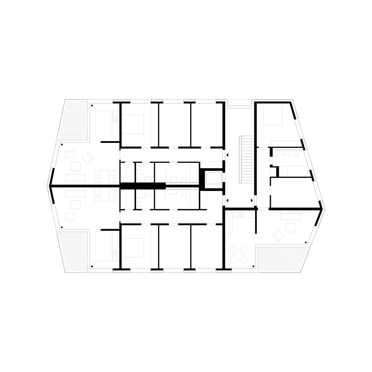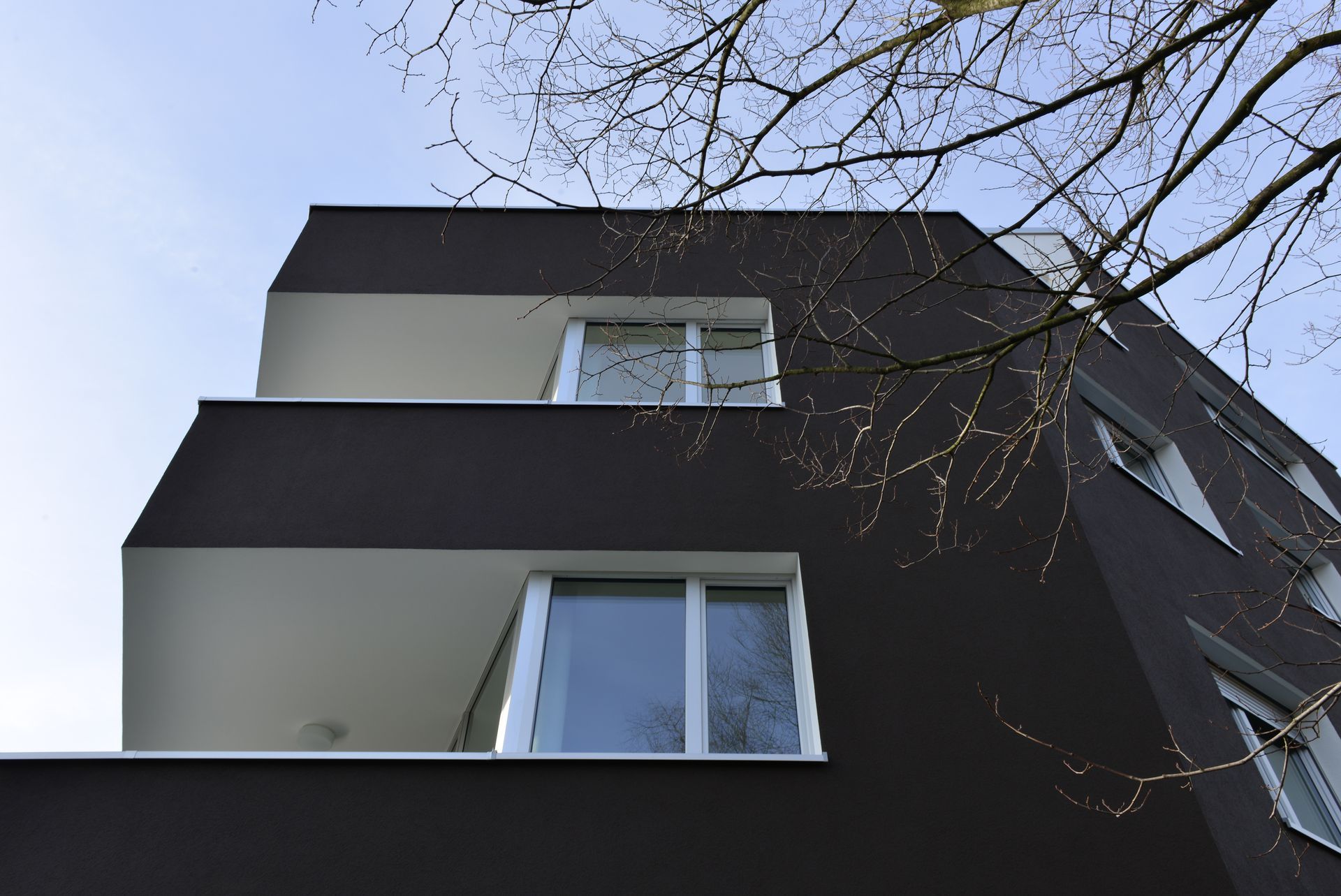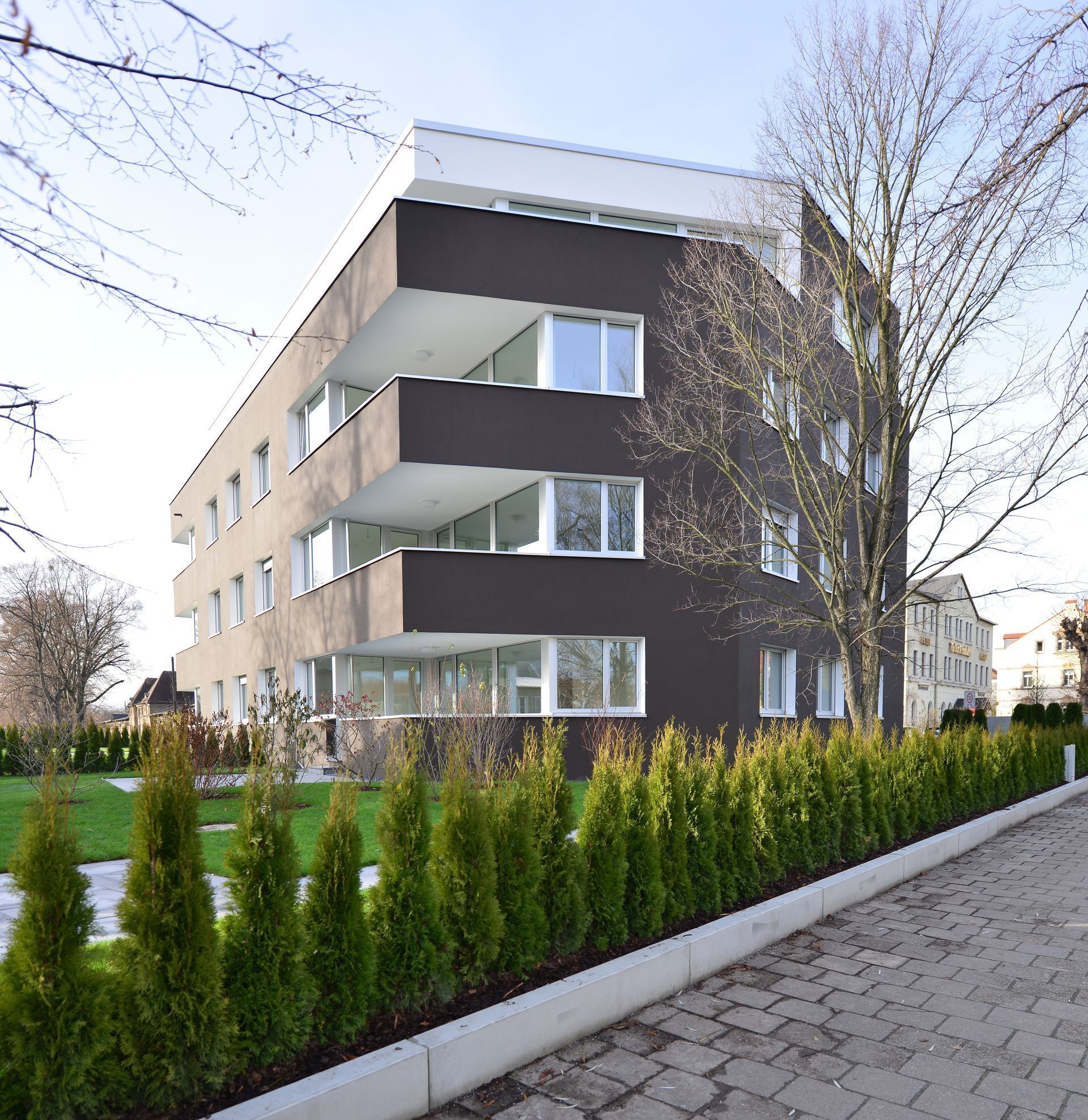Infolge des Strukturwandels im Pferderennsport stehen im Areal der Galopprennbahn ehemalige Wirtschaftsflächen vor der Umwandlung zu einem attraktiven, zeitgemäßen Wohnquartier. Umgeben von mehreren Ensemblebebauungen aus unterschiedlichen Epochen des letzten Jahrhunderts, lag die Bebauung des Areals mit einem Mix aus freistehendem und blockrandschließendem Geschosswohnungsbau nahe. Der Grünraum der Galopprennbahn Dresden bietet hierbei eine Anbindung an ein hochwertiges Wohnumfeld mit architektonischen Anklängen an die mondänen Pferderenn-veranstaltungen des 19. Jahrhunderts. Angestrebt wurde ein Gebäudeentwurf, der durch seine markante Architektursprache auf die bestehende Umgebungsbebauung eingeht und als formgebender Baustein einer folgenden Wohnensemblebebauung in die Zukunft wirkt. Die lagerhafte, dreigeschossige Fassaden-struktur leitet über zu den Gebäudeteilen des nächsten Bauabschnittes, mit denen eine gemeinsame verbindliche Formensprache gefunden werden soll. Die Fassade geht so eine natürliche Verbindungen mit den in den 1930´er Jahren entstandenen Wohngebäuden und deren horizontalen Gestaltungsmerkmalen ein. Das dreispännig gegliederte Gebäude auf polygonalem Grundriss verfügt über drei gleiche Geschosse, ein Staffelgeschoss und Tiefgarage. Der Baukörper ist charakterisiert durch seine unregelmäßige Grundform und die in der perspektivischen Betrachtung entstehenden dynamischen Fassadengliederung. Auf additive Elemente wie Balkone wurde bewusst verzichtet. Im Vordergrund stand eine klare, massehafte Wirkung des Baukörpers die durch eingeschnittene Loggien an den Gebäudeecken aufgelockert wird. In Verbindung mit ausgewogenen, die Fassadenflächen gut ausspannenden Lochfassadenfeldern an den Längsseiten erhält die Hülle eine spannungsreiche Struktur ohne unruhig zu wirken. Unterstützt wird das subtraktive Volumenkonzept durch eine kontrastreiche Farbgestaltung der Fassade. Der Gebäudeentwurf zeigt neue Möglichkeiten im Mietwohnen der Stadt Dresden und bietet den Bewohnern ein Wohnumfeld mit starken Qualitäten im Innen- und Aussenbereich.