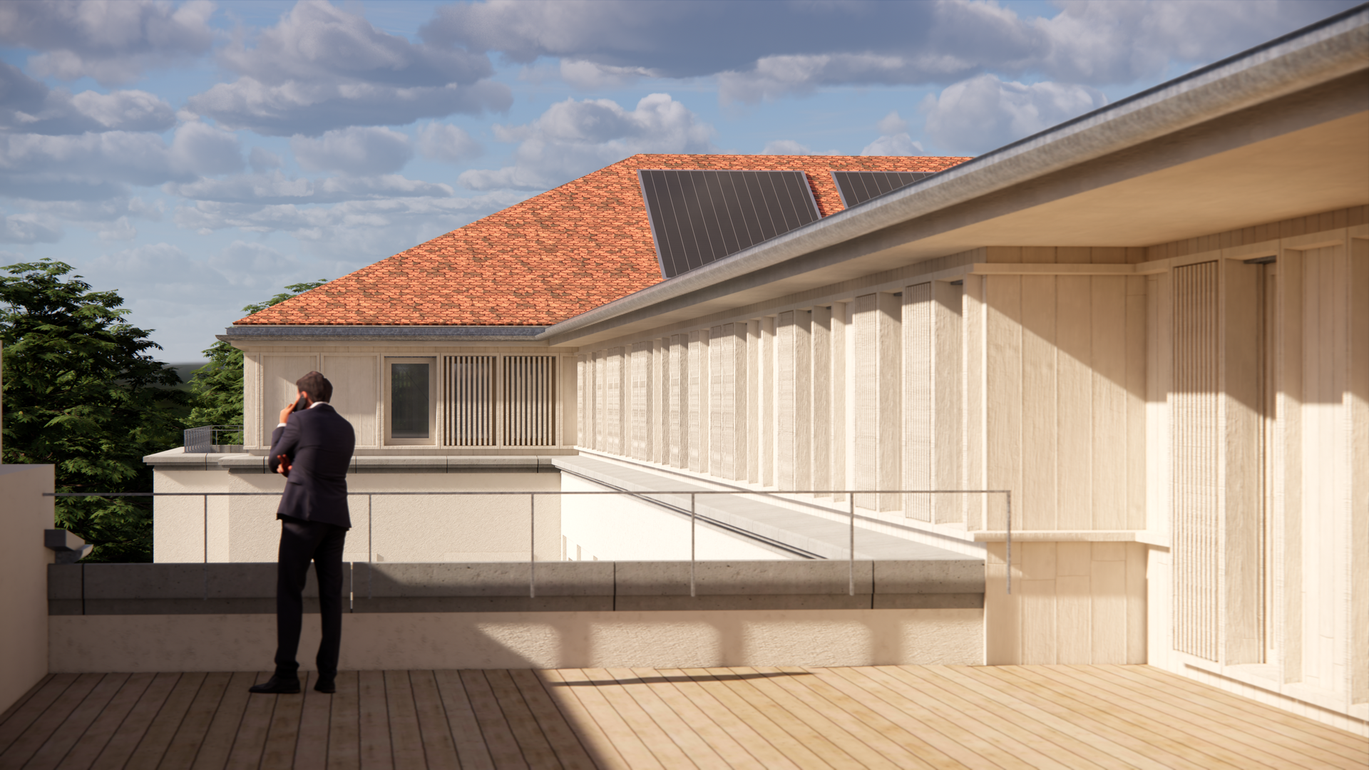 Durch die Aufstockung kann die historisch geplante Terrasse im Südflügel erstmals genutzt werden – nach denkmalgerechter Sanierung und Anpassung an heutige Brandschutzvorgaben.