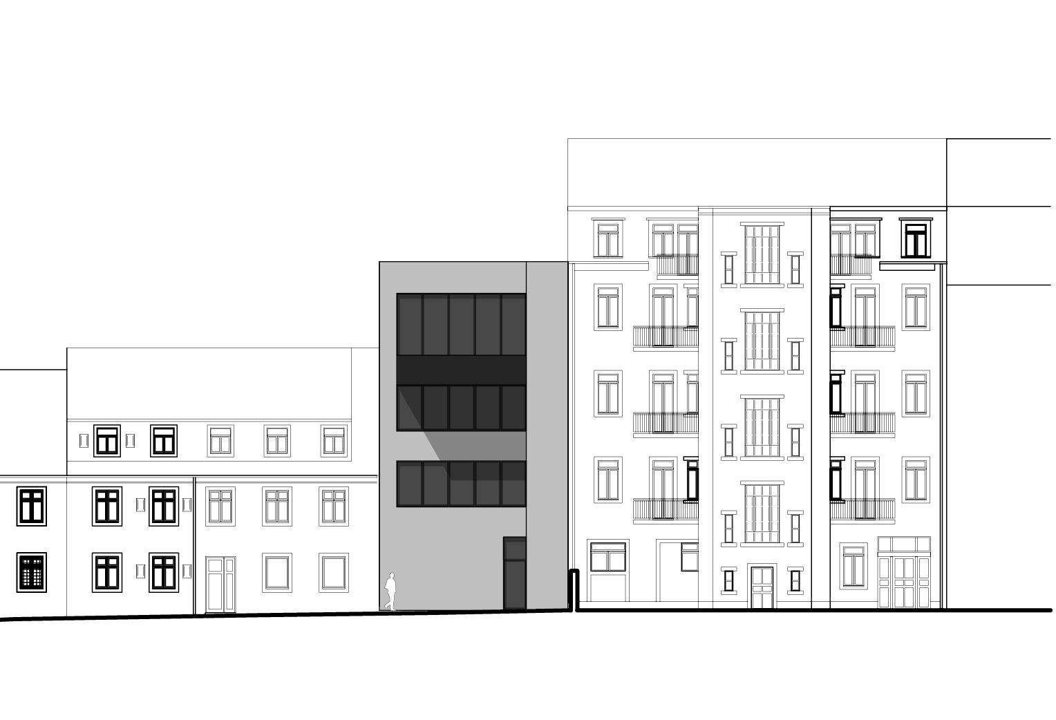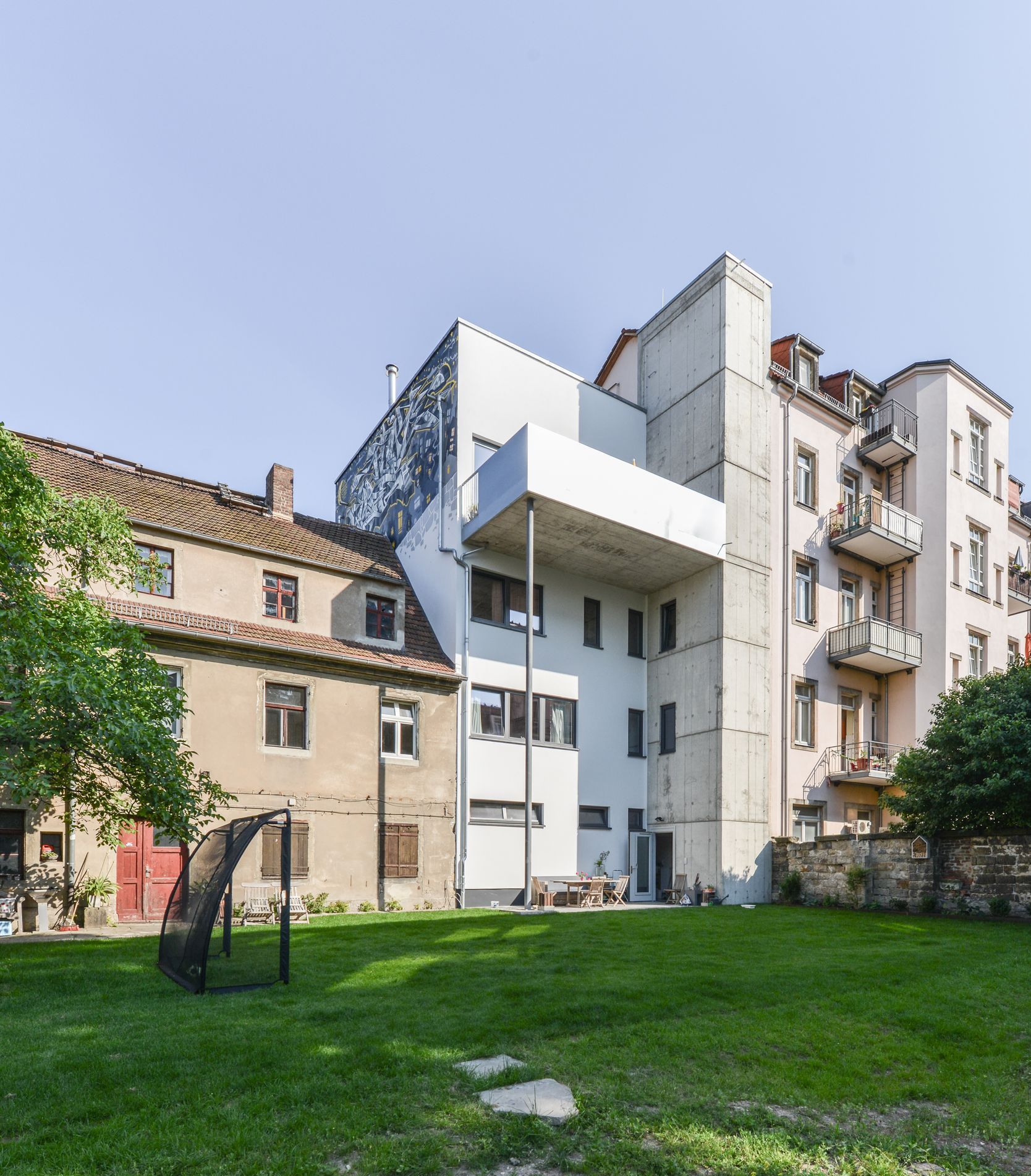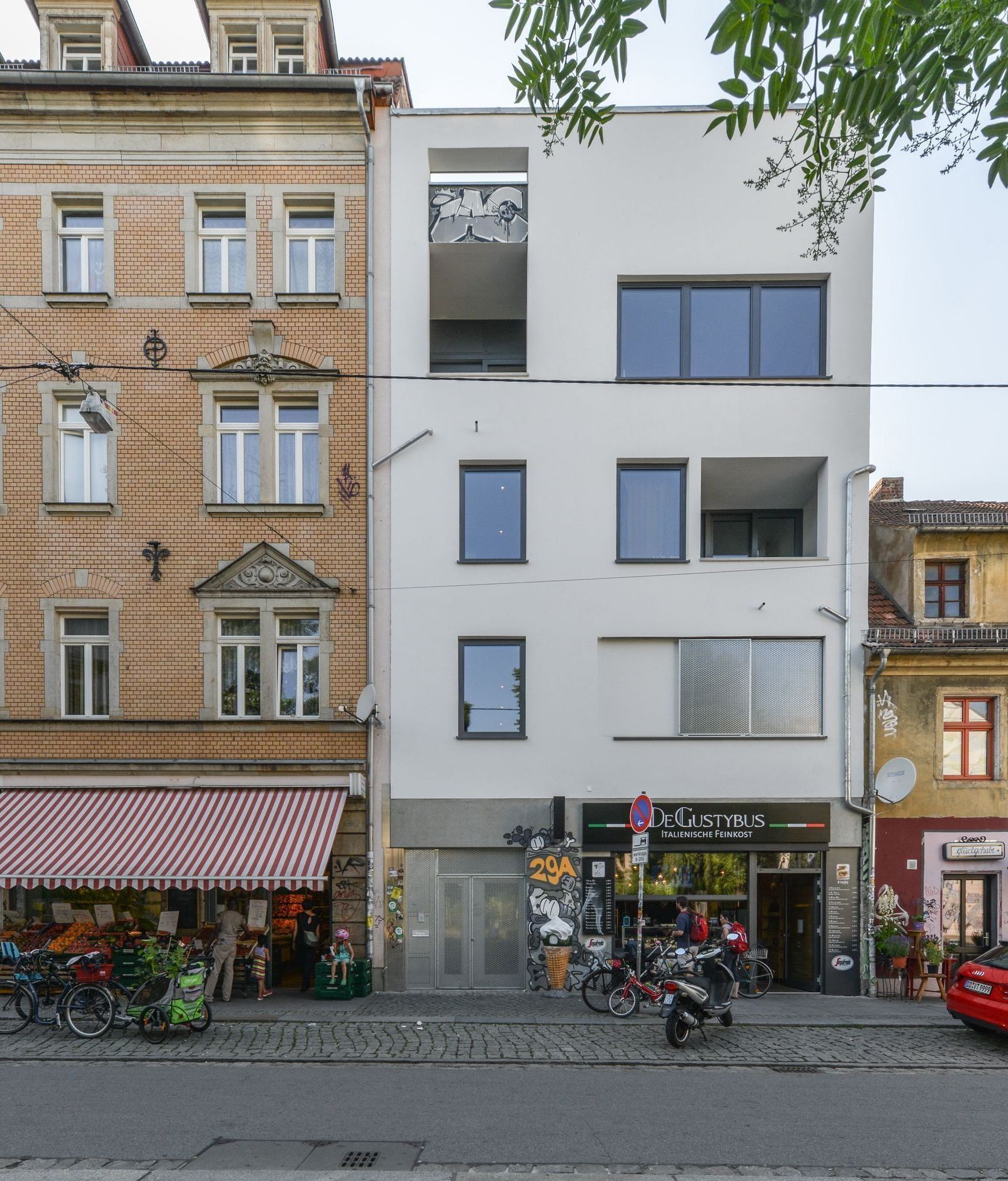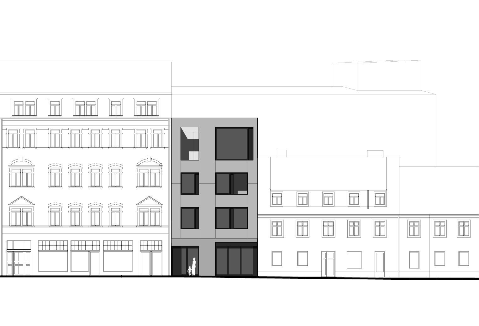 Das innerstädtische Einfamilienhaus fügt sich in eine schmale Baulücke auf der lebendigen Alaunstraße ein. In Kubatur und Position vermittelt es ganz selbstverständlich zwischen den stark unterschiedlichen Nachbarbebauungen. Das gegenüber eines kleinen Platzes gelegene Haus steht mit dem moderne Erscheinungsbild sinnbildlich für den individuellen, zeitgemäßen Stadtteil. Die klar gegliederte Lochfassade aus Beton wandelt, analog der dahinter befindlichen Nutzung, auf subtil, spielerische Weise Strenge in dezente Vielfalt. Die Straßenfassade nimmt eine schützende Haltung ein, wogegen sich die Hoffassade zum Licht und Innenhof öffnet. Wie für die Dresdner Neustadt typisch, wurde im Erdgeschoss eine Ladennutzung vorgesehen. Darüber befindet sich die dreigeschossige Wohneinheit der Bauherrenfamilie. Eine durch alle Geschosse führende einläufige Treppe erschließt die Wohneinheit ab dem Erdgeschoss. Die durchgesteckte, großzügige Wohnebene ist im obersten Geschoss über den Kinder- und Schlafgeschossen gelegen und verfügt über einen weit auskragenden Balkon mit direkten Außenraumbezug in den ruhigen und grünen Innenhof.