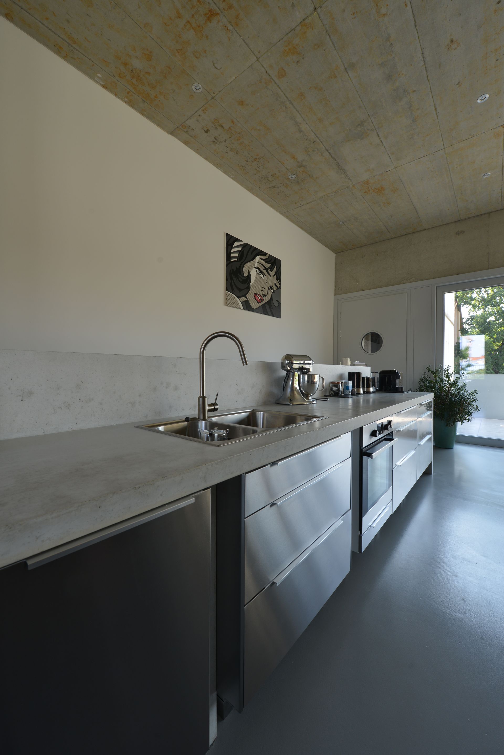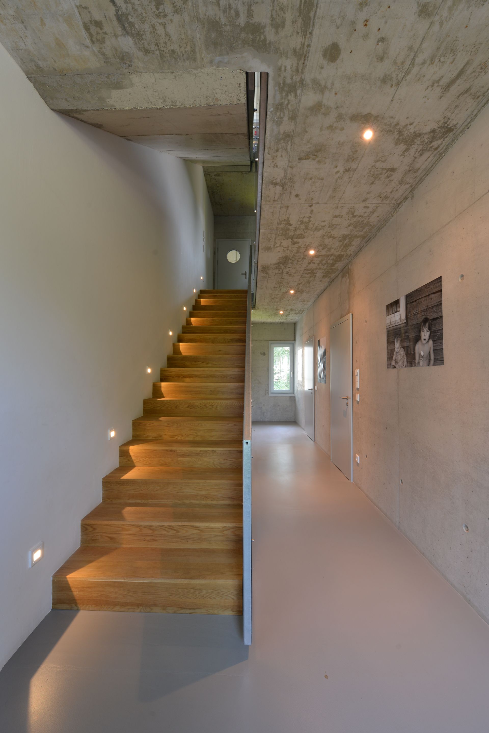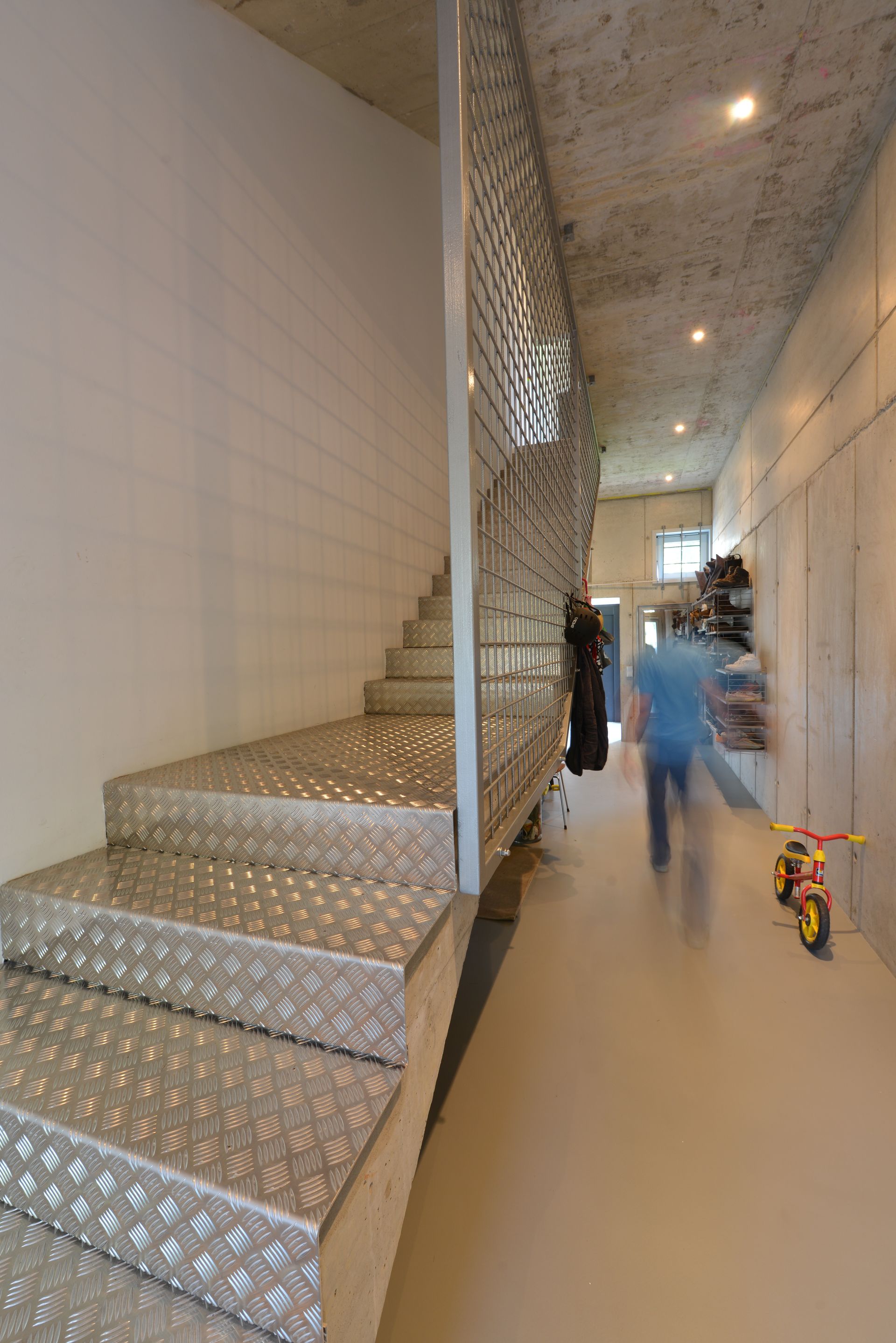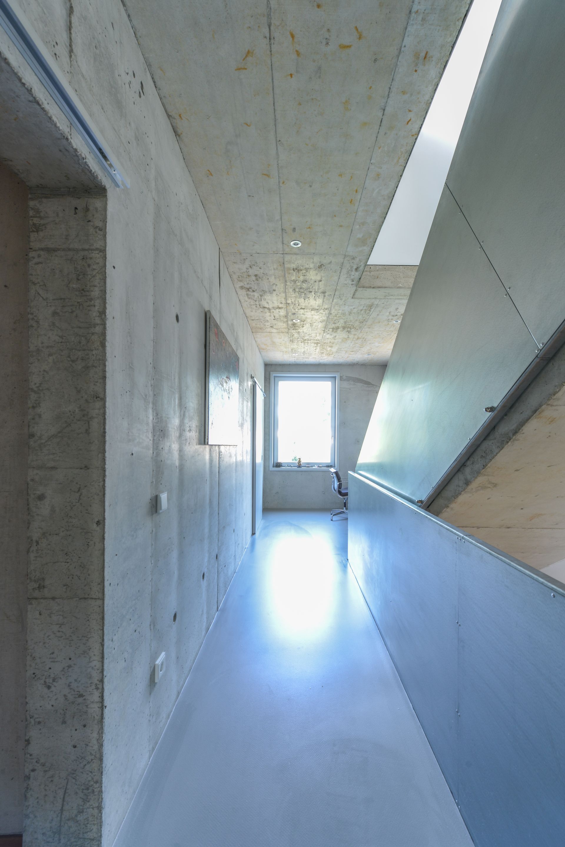 Das innerstädtische Einfamilienhaus fügt sich in eine schmale Baulücke auf der lebendigen Alaunstraße ein. In Kubatur und Position vermittelt es ganz selbstverständlich zwischen den stark unterschiedlichen Nachbarbebauungen. Das gegenüber eines kleinen Platzes gelegene Haus steht mit dem moderne Erscheinungsbild sinnbildlich für den individuellen, zeitgemäßen Stadtteil. Die klar gegliederte Lochfassade aus Beton wandelt, analog der dahinter befindlichen Nutzung, auf subtil, spielerische Weise Strenge in dezente Vielfalt. Die Straßenfassade nimmt eine schützende Haltung ein, wogegen sich die Hoffassade zum Licht und Innenhof öffnet. Wie für die Dresdner Neustadt typisch, wurde im Erdgeschoss eine Ladennutzung vorgesehen. Darüber befindet sich die dreigeschossige Wohneinheit der Bauherrenfamilie. Eine durch alle Geschosse führende einläufige Treppe erschließt die Wohneinheit ab dem Erdgeschoss. Die durchgesteckte, großzügige Wohnebene ist im obersten Geschoss über den Kinder- und Schlafgeschossen gelegen und verfügt über einen weit auskragenden Balkon mit direkten Außenraumbezug in den ruhigen und grünen Innenhof.