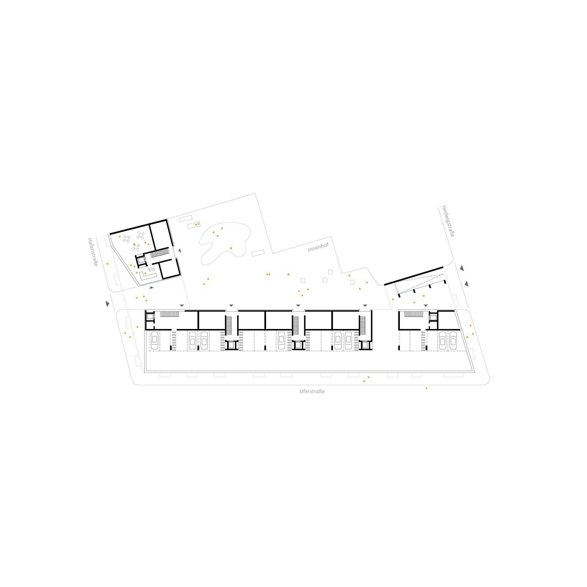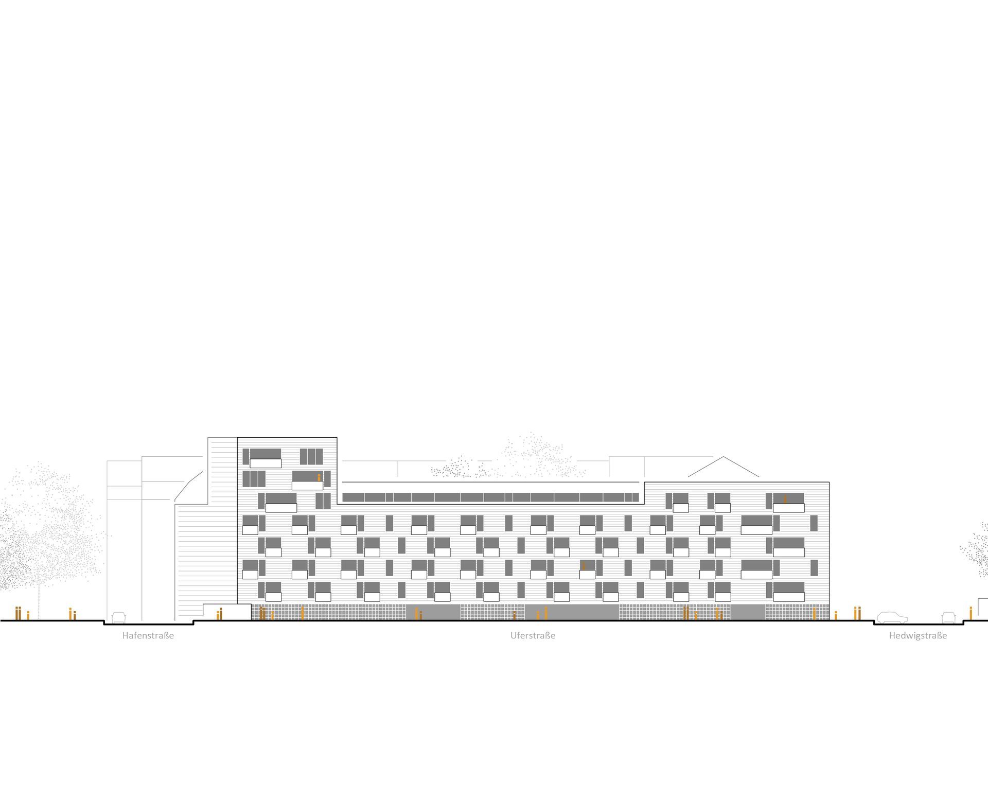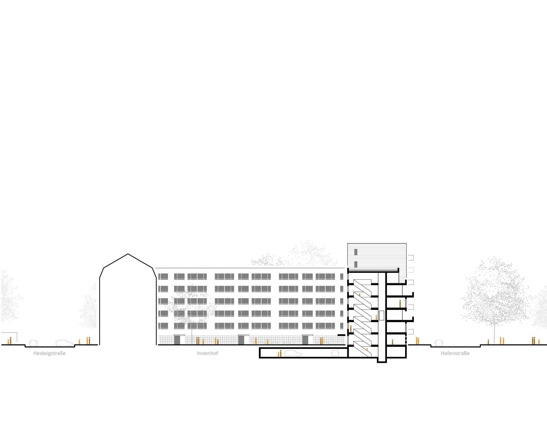 Das zu beplanende Areal bildet den östlichen, baulichen Auftakt und das erste Bauvorhaben zur neuen Dresdner Hafencity. Die nähere Umgebung ist durchmischt von Bestandswohnbebauungen, Gewerbegebäuden, Kleingärten, der Elbe mit festverankerten Jugendherbergsschiffen, einer Sommerwirtschaft, morbiden Backsteingebäuden und dem Hafenbecken nebst kleiner Sportboote. An sonnigen Tagen genießen bereits jetzt hauptsächlich Dresdner den Radweg zum Radeln, Skaten, Flanieren und gönnen sich den Ausblick auf das gegenüberliegende Ostragehege mit Yenize. Diese wild gewachsene, charmante Inhomogenität inspiriert zu einem dem Ort gerecht werdenden Gebäude. Bereits bei der Beschäftigung mit dem zu beplanenden Areal, öffnet sich der Blick für die potentialreiche Umgebung. Ziel sollte weiterhin ein lebendiges, vielschichtiges Freizeitgeschehen und eine gute soziale Durchmischung im Quartier und Umgebung sein. Die unverbaubaren Uferbereiche der Elbe sichern Ausbreitungsbereiche bei hohen Pegelständen und bieten Freiräume zur Naherholung.Blickt man zeitlich zurück waren die Planungsgrundstücke Teil einer geschlossenen Blockrandbebauung. Ziel ist es heute, diese Struktur wieder herzustellen. Die bisher unbebauten Grundstücke des offenen Blockrandes umfassen 6 Flurstücke. Davon befinden sich 5 Flurstücke im Eigentum des Investors. Ein Flurstück gehört der Stadt Dresden. Bei der ganzheitlichen Projektentwicklung und Neustrukturierung des geplanten Quartiers „Hafencity“ bietet es sich an, den Blockrand als eine großmaßstäbliche Gebäudeskulptur aufzufassen. Die Lage bietet für eine Vielzahl von Nutzergruppen ein ideales Wohn- und Lebensumfeld. Ziel sollte eine gute Durchmischung verschiedenster sozialer Gruppen und Generationen sein, um auf lange Sicht die sozialen Strukturen des Gebietes zu stärken und den Bewohnern ideale und vor allem gesunde Wohnbedingungen für eine hohe Lebensqualität zur Verfügung zu stellen.Die großmaßstäbliche Wohnform bildet den baulichen Auftakt zur neu entstehenden Hafencity. Sie rahmt den Weg zur Elbe und behauptet sich mühelos zu dem gegenüberliegenden Bahndamm. Das zeitgemäße Erscheinungsbild verschmilzt die verschiedenen Parzellen zu einer Einheit. Der Baukörper stellt dadurch eine angenehme Abwechslung zu den vielschichtigen Umgebungsthemen, verleiht dem Ort neue Kraft und Stabilität. Die beiden neuen Blockecken erfahren eine Betonung in Form von Überhöhungen. Das früher häufig angewandte Thema des Turmes wird neu gedacht. Erschlossen wird das Gebäude hofseitig. Zwei Durchgänge, jeweils an der Hedwigstraße und der Hafenstraße, ermöglichen den Zugang zum Hof. Die PKWs der Bewohner gelangen ebenfalls über die Hedwigstraße zu den Parkflächen im Objekt. Geparkt wird hauptsächlich im Untergeschoss und Erdgeschoss. Das Erdgeschoss soll im Hochwasserfall schlimmstenfalls von Wasser durchströmt werden können, so dass das Parken eine flexible, adäquate Nutzung darstellt. In allen darüber liegenden Einheiten wird gewohnt. 1 – 5 Raum Wohnungen bieten unterschiedlichsten Wohnbedürfnissen Raum in einen modernen Rahmen. Die Wohnräume mit den angegliederten Loggien / Balkone orientieren sich in den öffentlichen Raum und beleben diesen und das Gebäude wechselseitig. Zusätzlich bietet diese Ausrichtung eine der Hauptqualitäten für die Mehrzahl der Wohneinheiten, den Elbblick bis hin zur historischen Stadtsilhouette. Die Schlafräumen wurden bewusst auf den ruhigen Innenhof ausgerichtet. Die Dachzone ist durch Überhöhungen und dazwischen angeordnete zurückgezogene Bereiche, die als Terrassen genutzt werden, charakterisiert. Hierdurch ist ein harmonischer Übergang an den Traufsims der Bestandsbebauung ermöglicht worden. Das Ergebnis ist ein dem Ort entsprechender, starker Baukörper, der mit der Vielzahl an Umgebungsthemen umgeht und diese bindet. Wirksam und in sich ruhend belebt er das Gebiet charakterstark und nachhaltig.