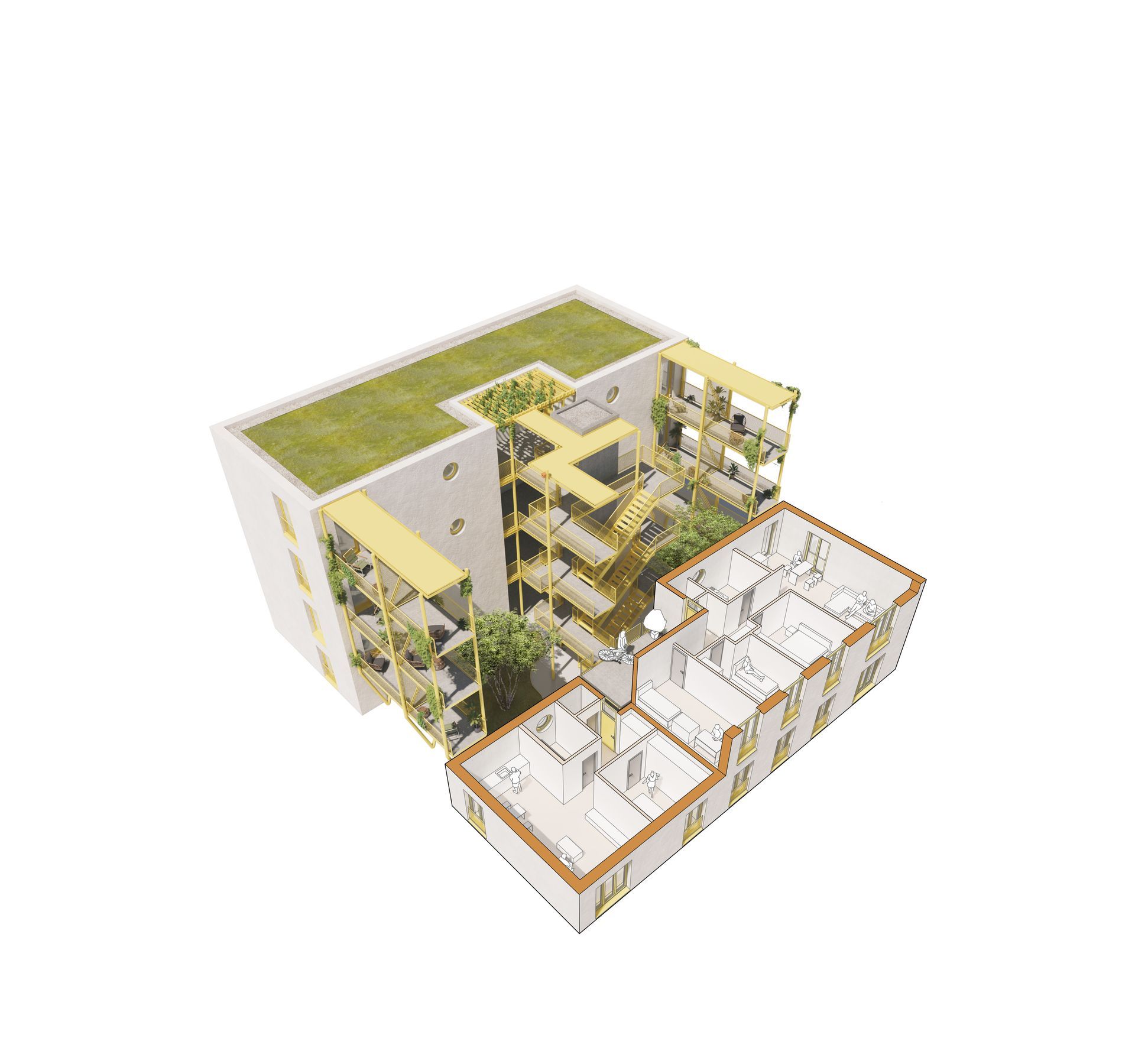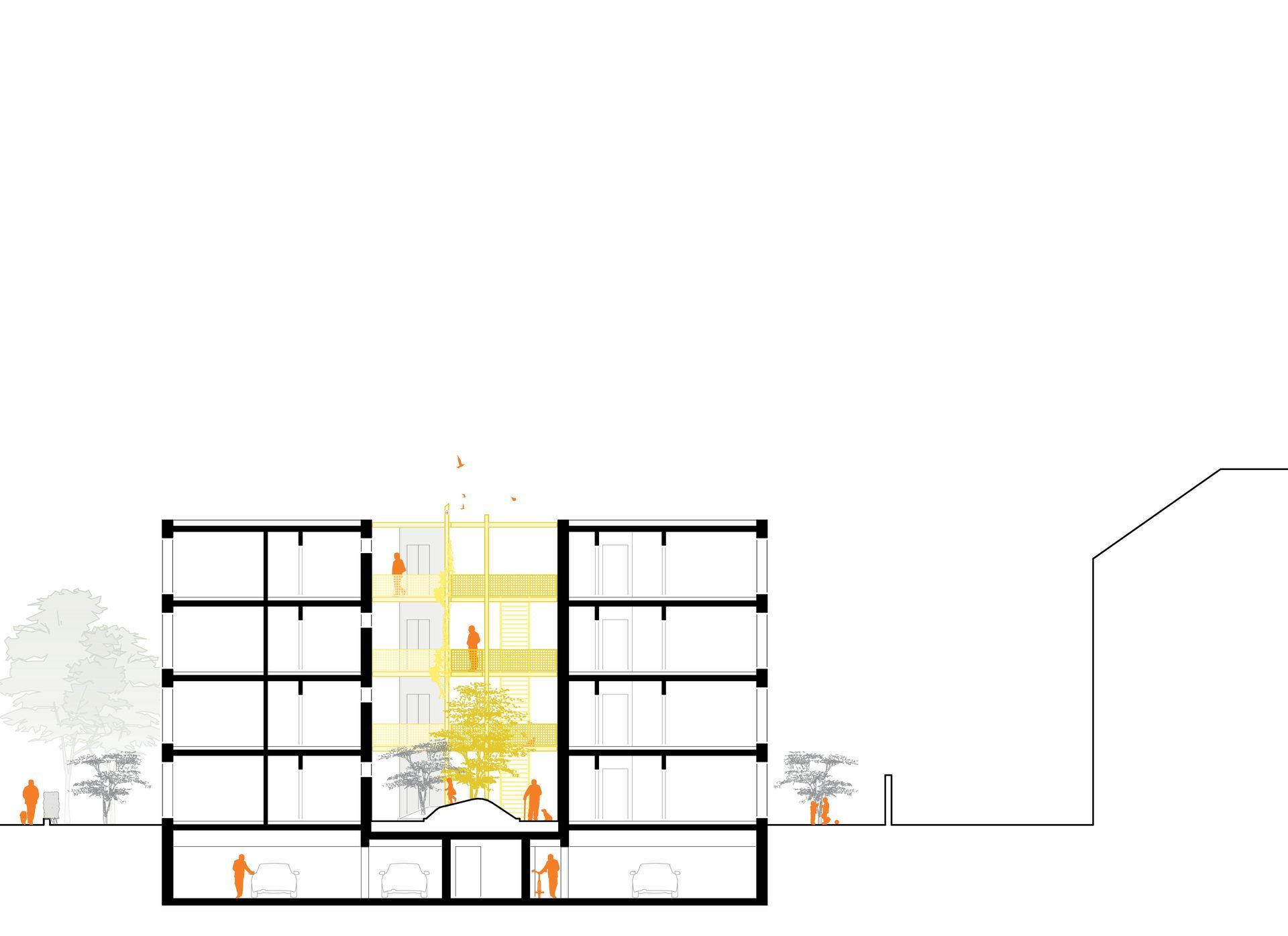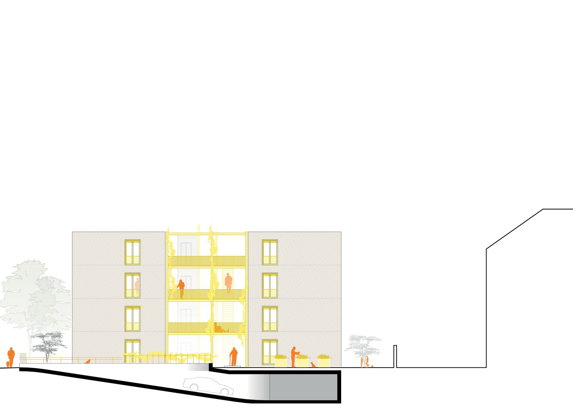 Die Architektur ist klar und zurückhaltend: Zwei unterkellerte Baukörper mit identisch gestapelten Grundrissen ermöglichen eine wirtschaftliche, einfache Bauweise mit minimalem Installationsaufwand. Alle Wohnungen sind ost-west-orientiert, bieten großzügige Wohnbereiche mit offenen Küchen, gut belichtete Aufenthaltsräume, außenliegende Bäder mit Fenstern sowie eigene Abstellräume. Ein vorgelagertes, konstruktiv unabhängiges Balkongerüst verbindet die Gebäude und schafft halbprivate Vorzonen. Die Konstruktion mit monolithischen Ziegelwänden, wenigen Fensterformaten und schnittstellenarmen Details sorgt für Langlebigkeit und Effizienz.