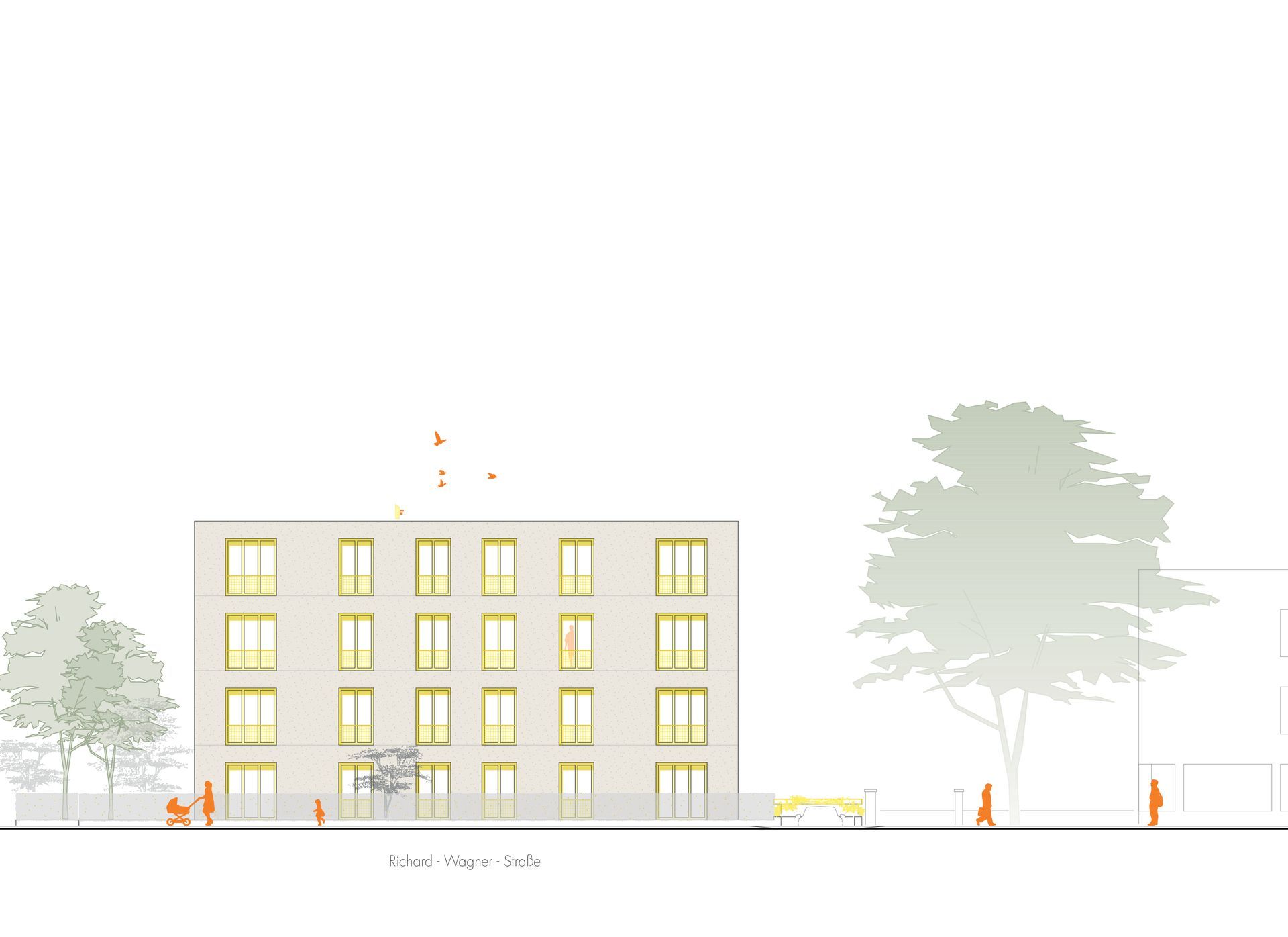 Ziel des Wettbewerbs ist die Entwicklung eines wirtschaftlichen, förderfähigen Wohnungsbaus im Niedrigpreissegment, der zugleich funktionale und gestalterische Qualität bietet. Das Baugrundstück liegt an der stark frequentierten Wiener Straße in Dresden, nahe der Richard-Wagner-Straße und einer internationalen Bahnverbindung – beides mit hoher Lärmbelastung. Der städtebauliche Kontext ist heterogen und reicht von Gründerzeitvillen über DDR-Wohnbauten bis hin zu modernen Anlagen. Erholungsräume wie der Blüherpark und der Große Garten befinden sich in fußläufiger Entfernung. Der Entwurf fügt sich mit klarer Haltung respektvoll in die bestehende Bauflucht entlang der Wiener Straße ein. Haupterschließung und Adressbildung erfolgen über diese Straße, während die Tiefgaragenzufahrt über die ruhigere Richard-Wagner-Straße organisiert ist. Eine gute Anbindung an den öffentlichen Nahverkehr ist gegeben.