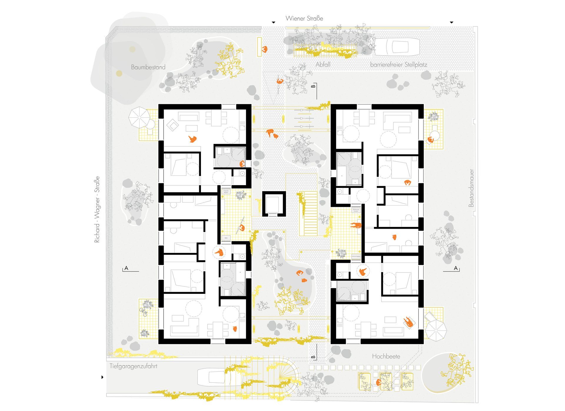 Die Außenanlagen setzen auf Begrünung, Strukturierung und soziale Aktivierung. Bestehende Bäume bleiben erhalten, die Vorgartenzone entlang der Wiener Straße wird hochwertig gestaltet. Der Zwischenraum erhält eine grüne, schattige Aufenthaltsqualität mit mehrstämmigen Gehölzen und rankenden Pflanzen. Rückwärtig ergänzen gemeinschaftliche Pflanzbeete, eine Sandspielfläche für Kleinkinder und gestaltete Pergolen für Müll- und Technikbereiche das wohnliche Gesamtkonzept.