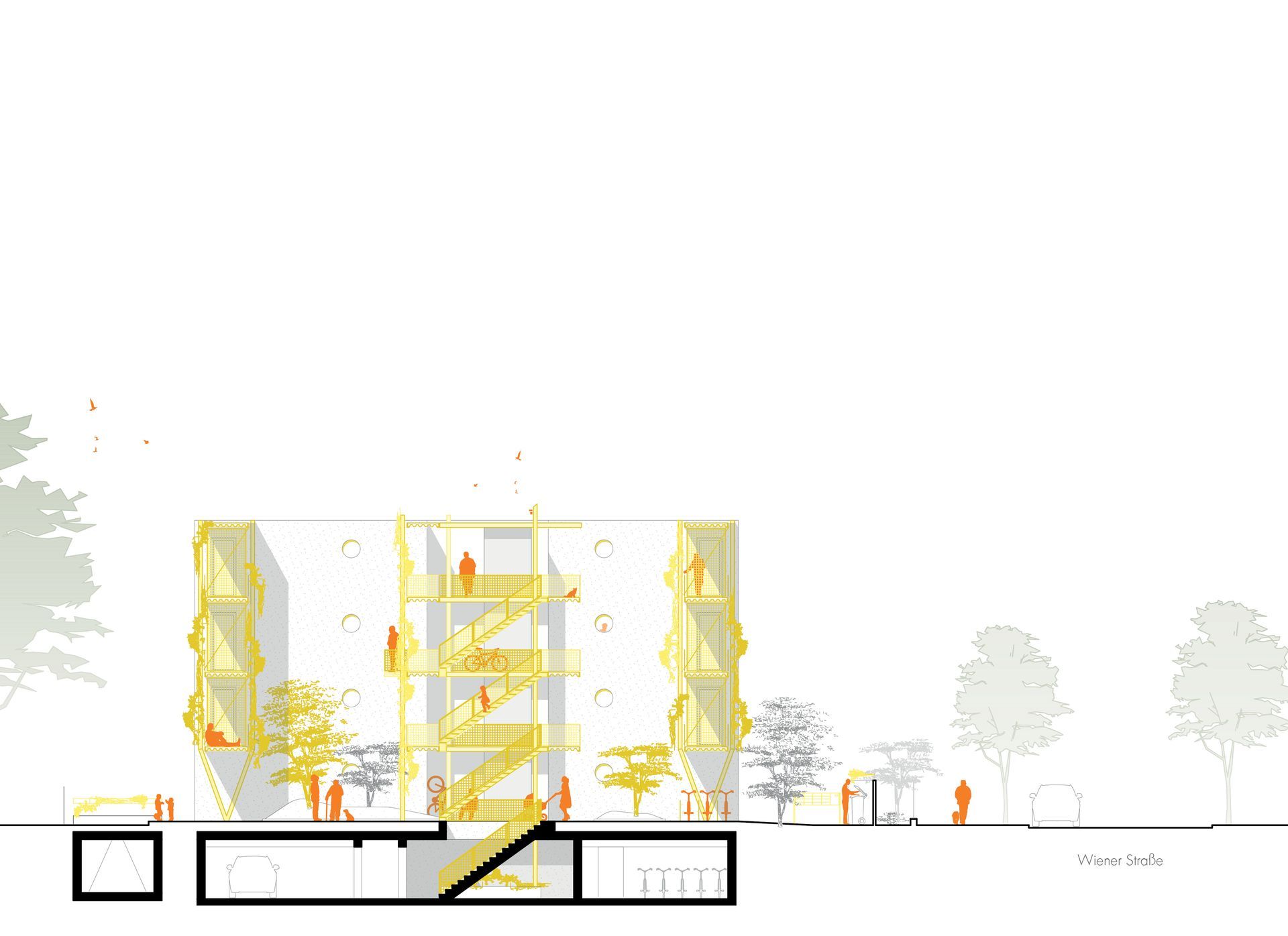 Kern des Entwurfs ist ein kompaktes, modular aufgebautes Wohnkonzept mit Fokus auf häufig nachgefragte 2- und 4-Raumwohnungen (55 m² bzw. 85 m²). Die einfachen, funktionalen Grundrisse bieten trotz Reduktion auf das Wesentliche eine hohe Wohnqualität. Zwei viergeschossige Baukörper werden versetzt entlang der Wiener Straße positioniert, dazwischen entsteht ein 7,5 m breiter Zwischenraum mit offenem Treppenhaus, Begegnungsflächen und gemeinschaftlich nutzbarem Freiraum. Barrierefreie Erdgeschosswohnungen und ein optionaler Aufzug sind vorgesehen.