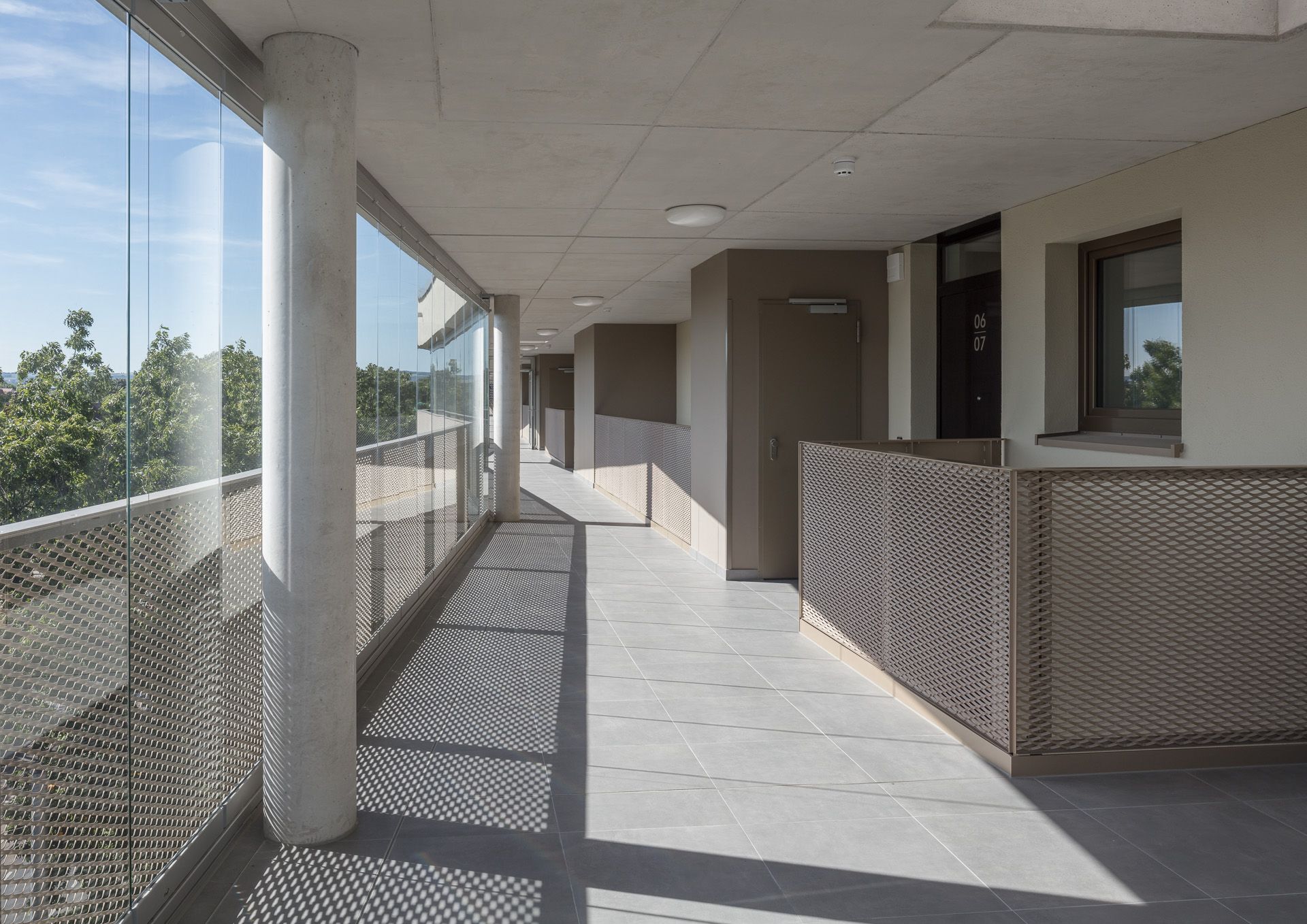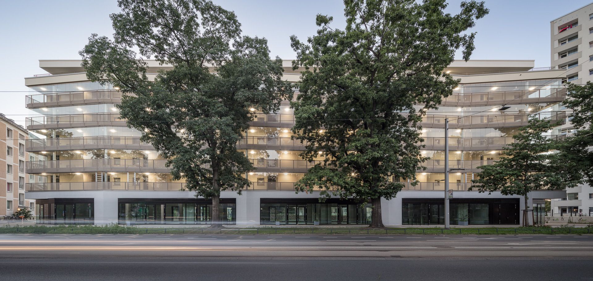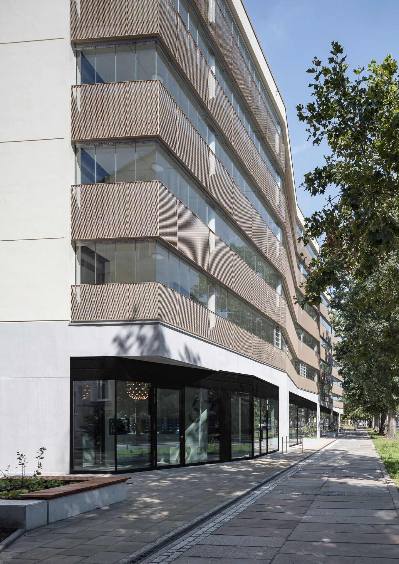 Das Erdgeschoss ist für eine großflächige öffentliche Nutzung als Stadteilbibliothek und Café flexibel gestaltet. Die darüber-liegenden Wohnebenen sind über Treppenhäuser an den beiden Gebäudeenden erschlossen. Über eine verglaste Laubengang-struktur zur Fetscherstraße sind beide Treppenhäuser verbunden, zusätzlich gewährt dieser Puffer Lärmschutz und dient als Begeg-nungszone und Ort des sozialen Austauschs. Alle Wohn- und Schlafräume sind hofseitig orientiert und profitieren von ruhiger, sonniger Ausrichtung. Die Architektur des Neubaus nimmt Maßstäblichkeit und Motivik der Umgebung auf und interpretiert sie neu. Die helle, mattglänzende Materialität fügt sich als Bindeglied zwischen den individuellen Stadthaustypen Striesens und den großmaßstäblichen Zeilen Johannstadts ein. Die Fassade ist horizontal gegliedert, verfügt über einen robusten Sockel für die öffentlichen Bereiche und eine Streckmetallfassade für die Wohnebenen. Verglaste Laubengänge gliedern die Ober-geschosse und lockern den Baukörper durch seine Transparenz auf. Die leichte Faltung der Fassade reagiert auf die Struktur der gegenüberliegenden Bebauung, den Rhythmus der Alleebäume, und erzeugt ein perspektivreiches und heiteres Erscheinungsbild.