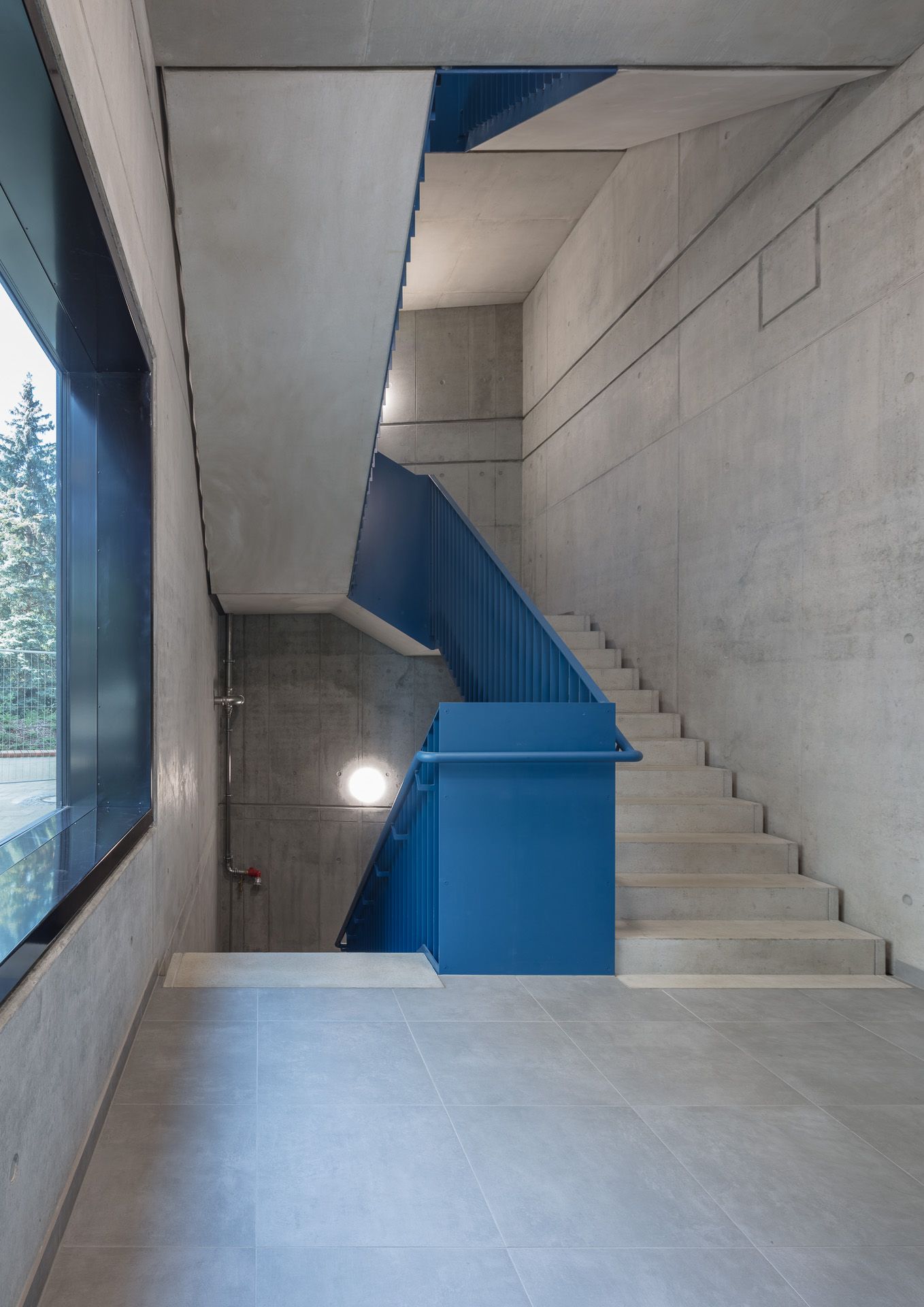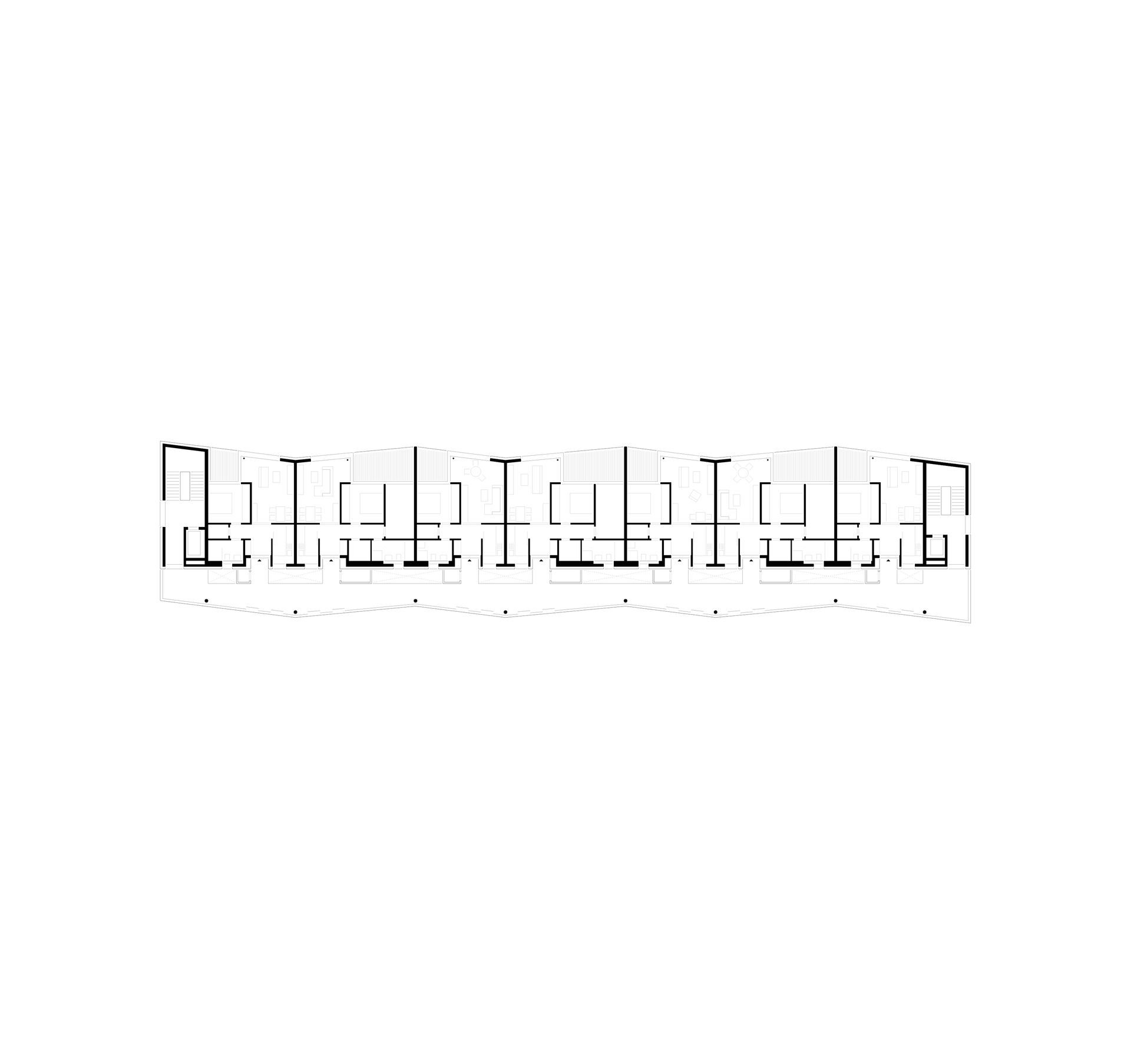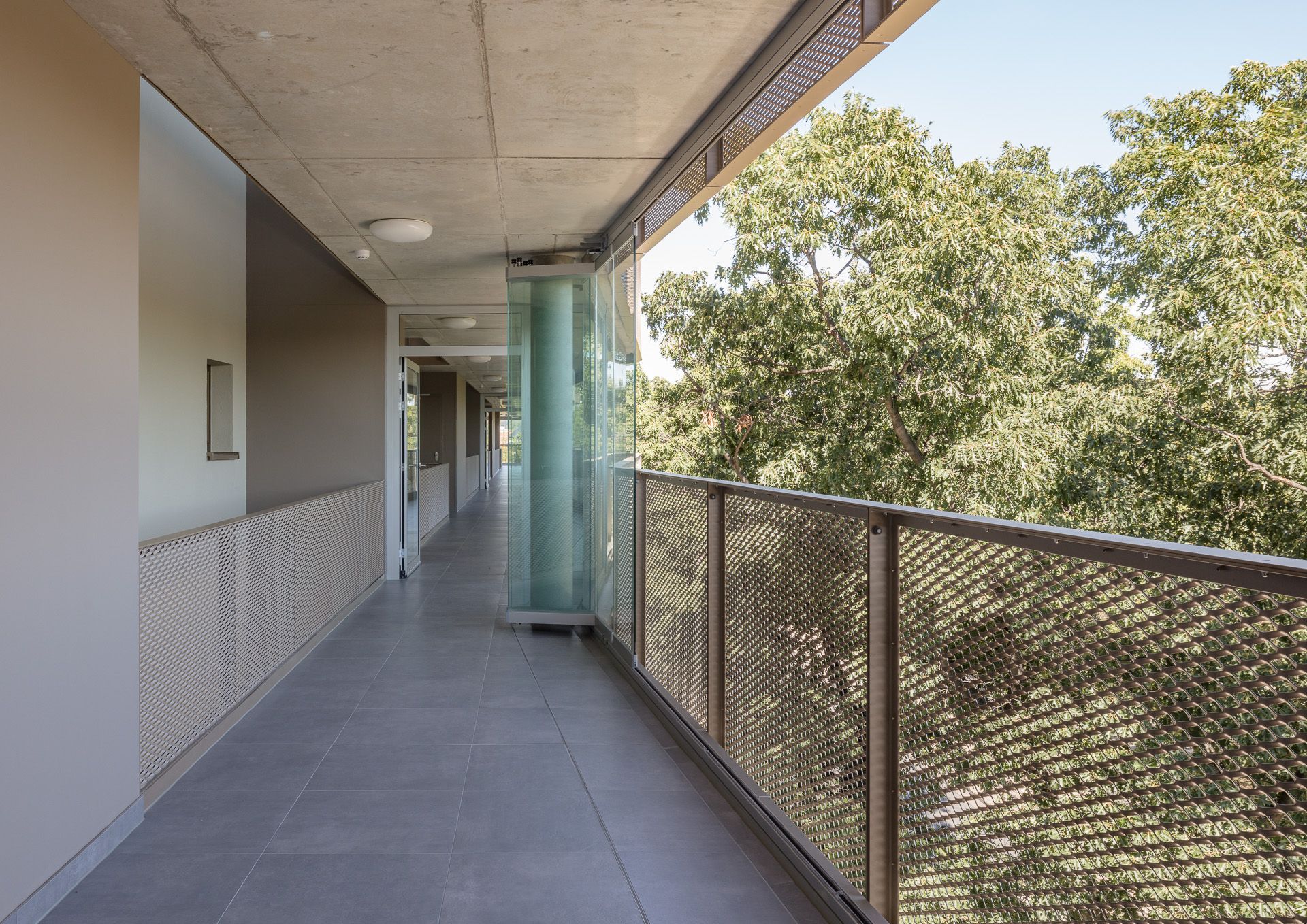 Das Erdgeschoss ist für eine großflächige öffentliche Nutzung als Stadteilbibliothek und Café flexibel gestaltet. Die darüber-liegenden Wohnebenen sind über Treppenhäuser an den beiden Gebäudeenden erschlossen. Über eine verglaste Laubengang-struktur zur Fetscherstraße sind beide Treppenhäuser verbunden, zusätzlich gewährt dieser Puffer Lärmschutz und dient als Begeg-nungszone und Ort des sozialen Austauschs. Alle Wohn- und Schlafräume sind hofseitig orientiert und profitieren von ruhiger, sonniger Ausrichtung. Die Architektur des Neubaus nimmt Maßstäblichkeit und Motivik der Umgebung auf und interpretiert sie neu. Die helle, mattglänzende Materialität fügt sich als Bindeglied zwischen den individuellen Stadthaustypen Striesens und den großmaßstäblichen Zeilen Johannstadts ein. Die Fassade ist horizontal gegliedert, verfügt über einen robusten Sockel für die öffentlichen Bereiche und eine Streckmetallfassade für die Wohnebenen. Verglaste Laubengänge gliedern die Ober-geschosse und lockern den Baukörper durch seine Transparenz auf. Die leichte Faltung der Fassade reagiert auf die Struktur der gegenüberliegenden Bebauung, den Rhythmus der Alleebäume, und erzeugt ein perspektivreiches und heiteres Erscheinungsbild.
