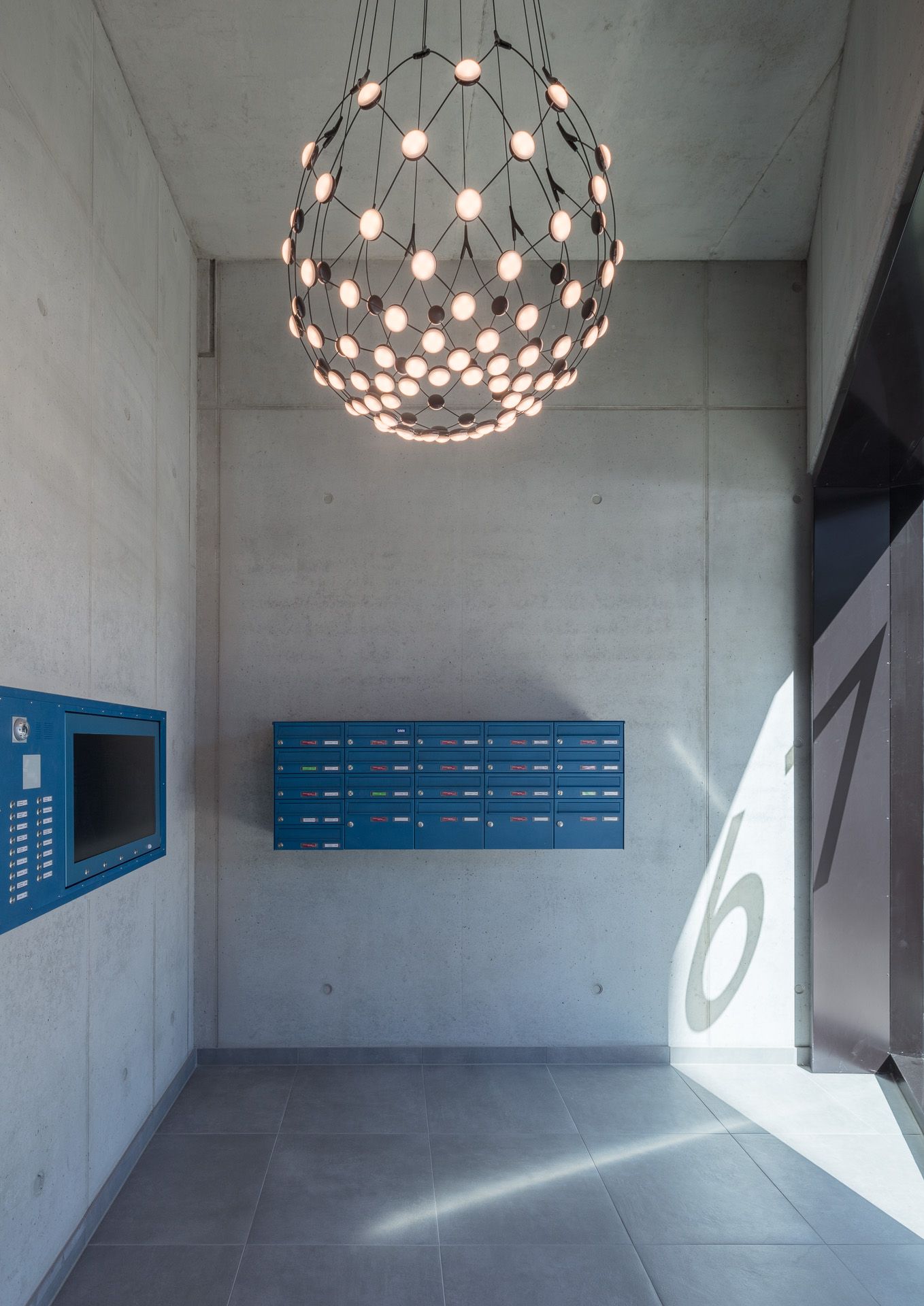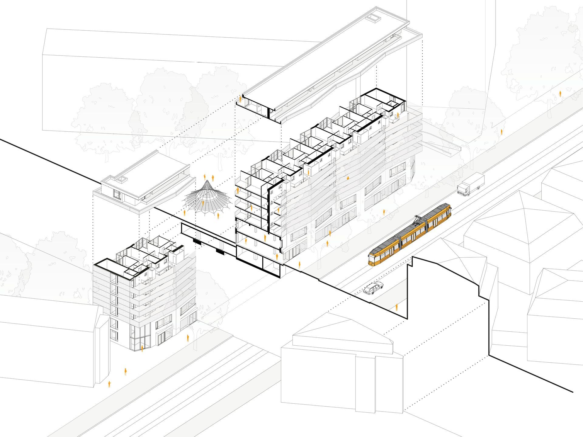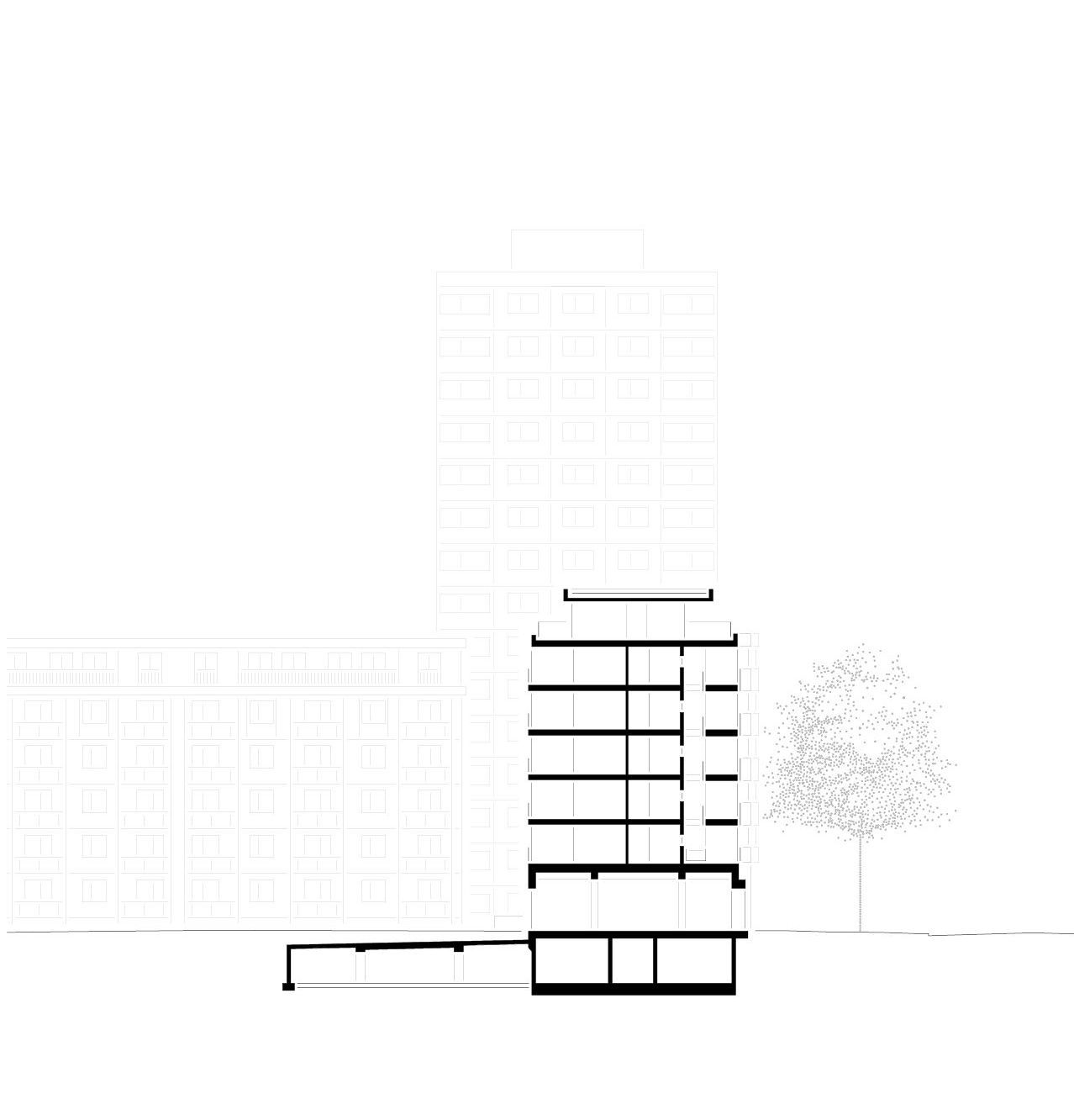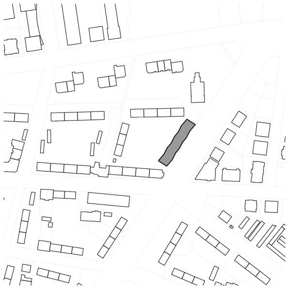 mit offenen und angemessen distanzierten Stirnseiten zu den Nachbarn, Auskragungen als architektonische Interventionen aktivieren städtebaulich. Der grüne Hof wird durch das neue Gebäude vor Schallemissionen geschützt und zu einer ruhigen Grünanlage mit attraktiven Nutzungsmöglichkeiten aufgewertet. Die Mischnutzung des Gebäudes als Wohn- und Geschäftshaus bedingt die Erschließung und die Gebäudestruktur.