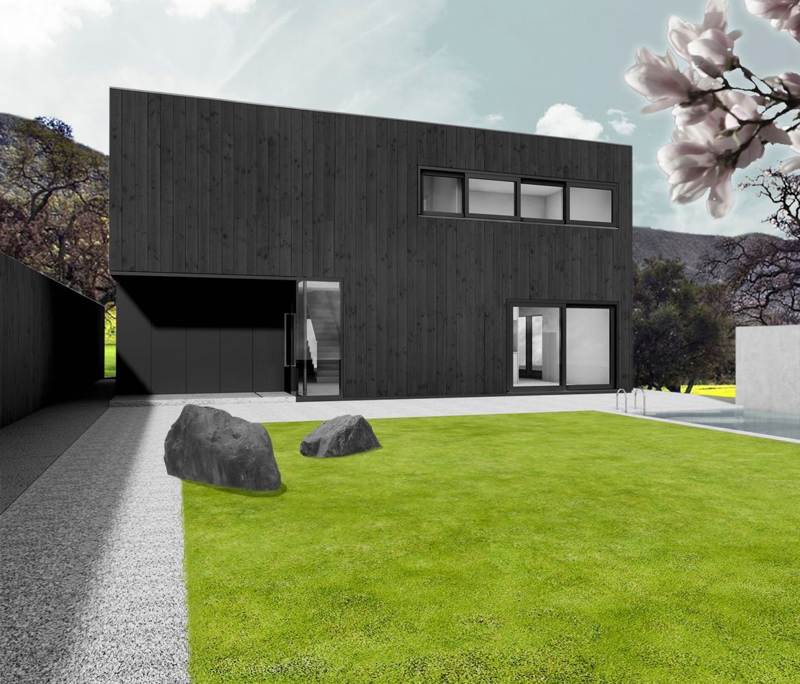 Wohnen in ländlichem, teils landwirtschaftlich geprägtem Umfeld - die Umsetzung einer modernen Hauskonzeption mit großzügiger, zeitgemäßer Wohnnutzung für eine Familie mit Kindern, deren Wohnansprüche an städtischen Wohnerfahrungen orientiert sind - war Anforderung für diesen Entwurf. Besondere Beachtung findet hierbei die Auseinandersetzung mit der nachbarschaftlichen Situation im sozialen wie landschaftlichen Kontext der unmittelbaren Umgebung in Bärnsdorf. Der Entwurf mündet in der Gewinnung eines für zeitgemäße Wohnzwecke benutzbaren Baugrundstückes durch die Schaffung eines zusammenhängenden Gebäude-Außenanlagen-Komplexes, bestehend aus den Elementen Wohngebäude, Nebengebäude, Mauerelement und Gartengrundstück. Die Kubatur ist bewusst reduziert, die Hülle ist hölzern, zurückgenommen, einzige Schwerpunkte bilden die jeweils auf die gegensätzlichen Außenräume - Landschaft und Garten – ausgerichteten Öffnungen. Auf gestalterische Hervorhebungen im Fassadenbereich wird mit Rücksicht auf die robuste Eigenart der landwirtschaftlichen Umgebungsbebauung verzichtet.