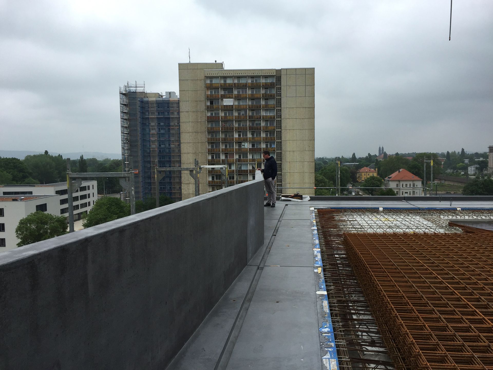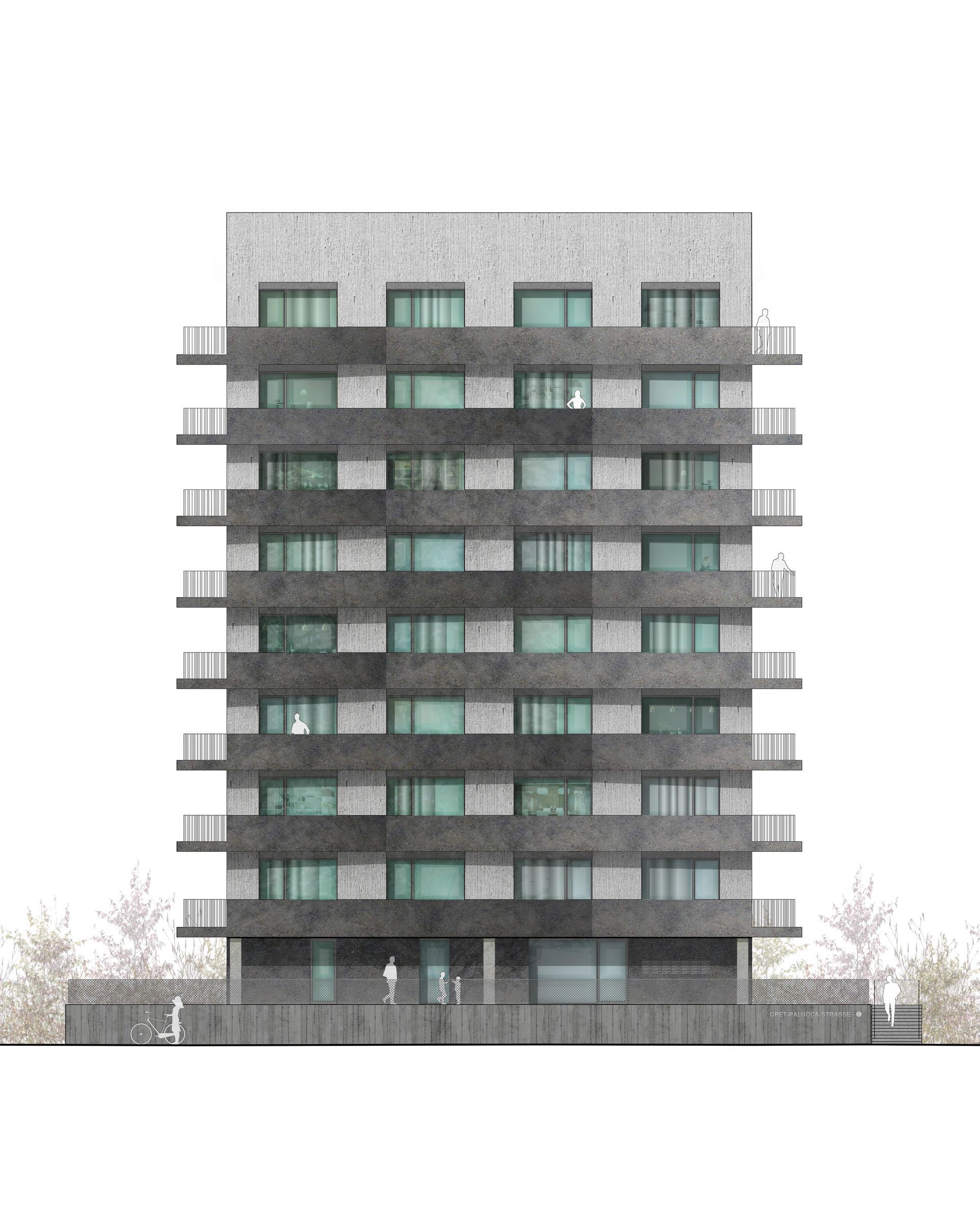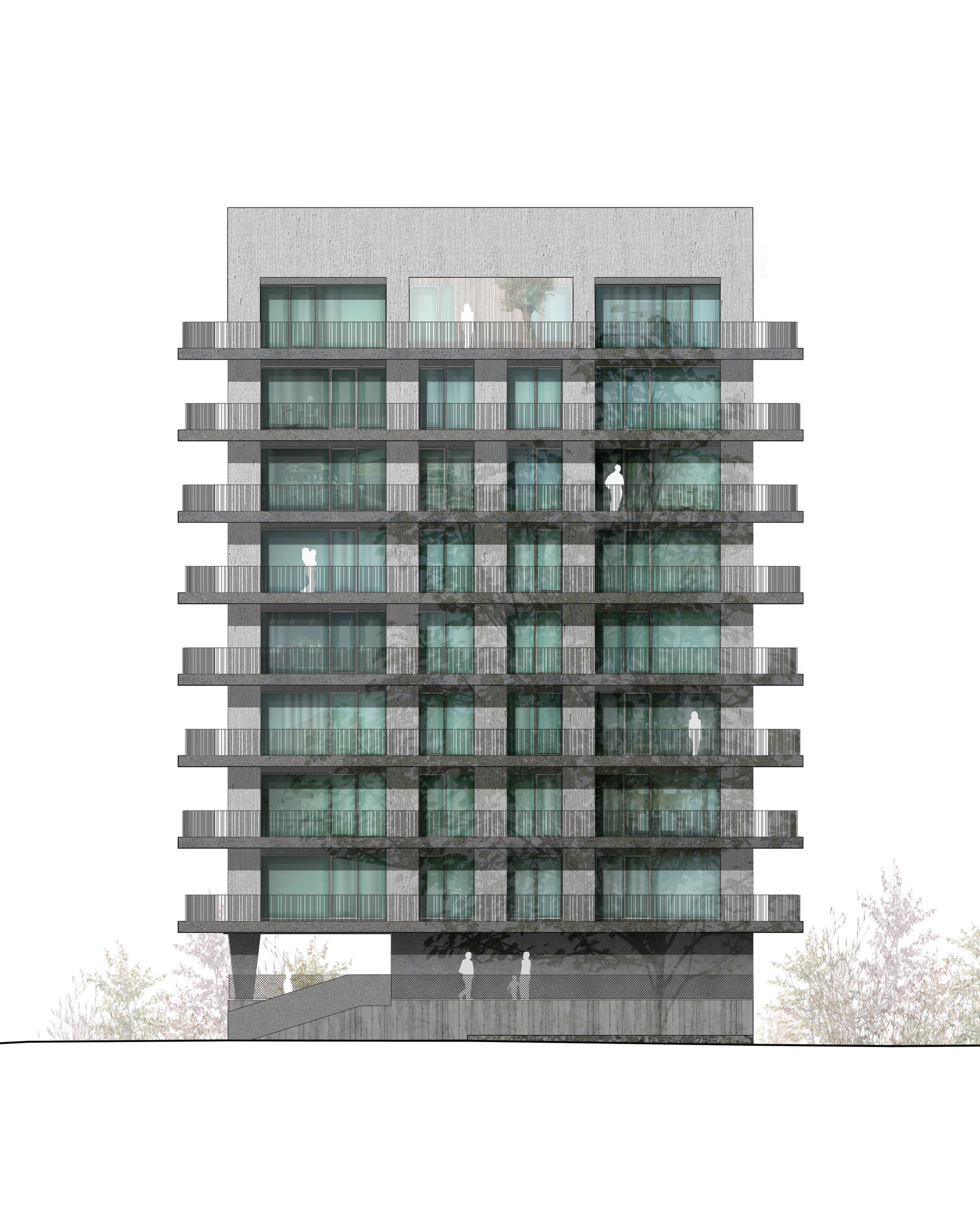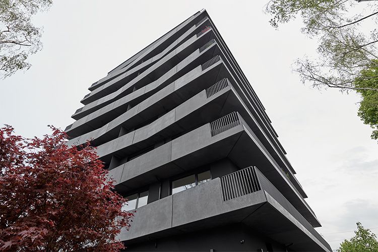 Der 2017 fertiggestellte Wohnsolitär von LeinertLorenz Architekten spricht eine klare Materialsprache aus Beton und Stahl. Der Solitär erhebt sich markant in eine Höhe von 27 Metern und ist somit eine Seltenheit in der neuen Dresdner Stadtgeschichte. In der von Grün durchzogenen Gegend setzt sich der Neubau klar ab und ergänzt die umliegende Szenerie um einen zusätzlichen, individuellen Stadt-baustein, der vielleicht erst auf den zweiten Blick seinen ganzen Charme entfaltet. Ebenso großzügig wie den Charakter des Gebäudes prägend, sind die überkragenden Balkone - auf der adressbildenden Seite und ihrem Gegenüber mit schützenden Betonbrüstungen, auf den verbleibenden zwei Seiten mit Stahl-geländer gestaltet. Durch die etagenweise vorgenommene Verschiebung der Knicke und Falze entfalten die Balkonbänder ein fließendes perspektivisches Spiel und die Konstruktion erhält eine dem Beton sonst nur schwer zu entlockende, fast tänzerische Dynamik.Das Material wurde im Großen und im Kleinen gestaltet. In erster Linie ist die Fassade natürlich mit Knicken und Versprüngen wahrnehmbar. Jedes einzelne Bauteil erhielt aber auch unterschiediedliche Oberflächenveredlungen wie sehr glatt und gesäuert.