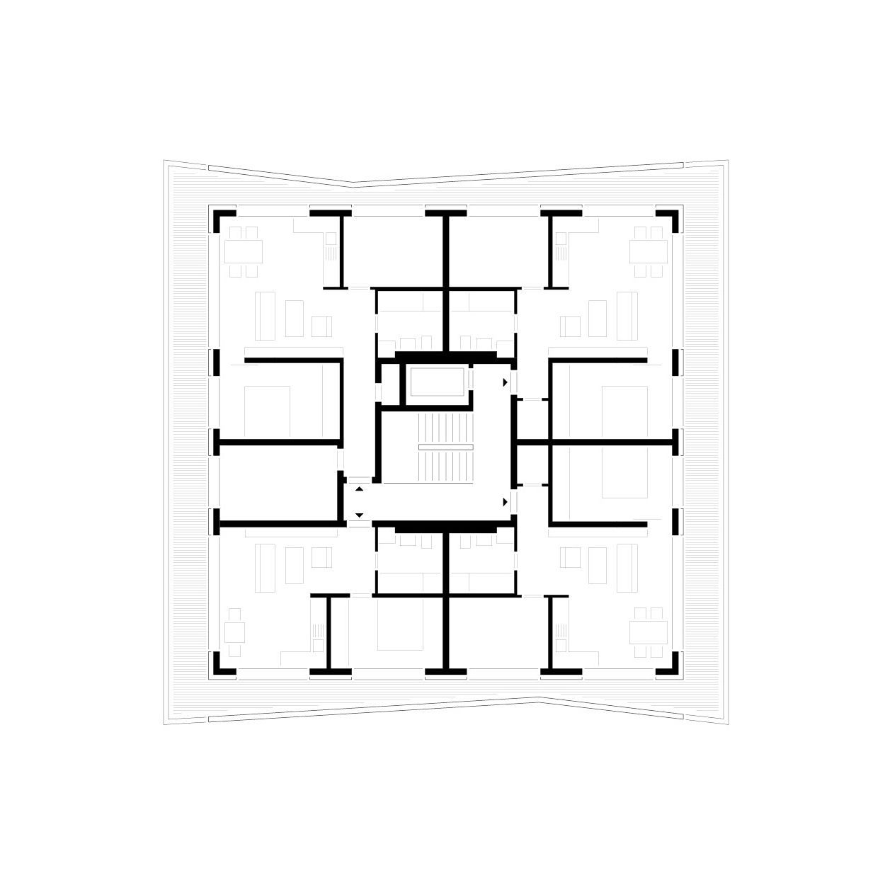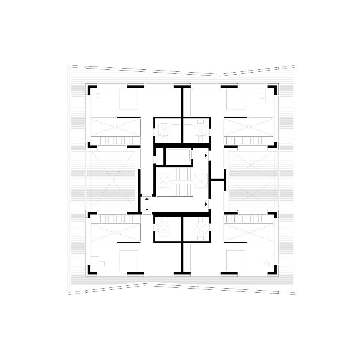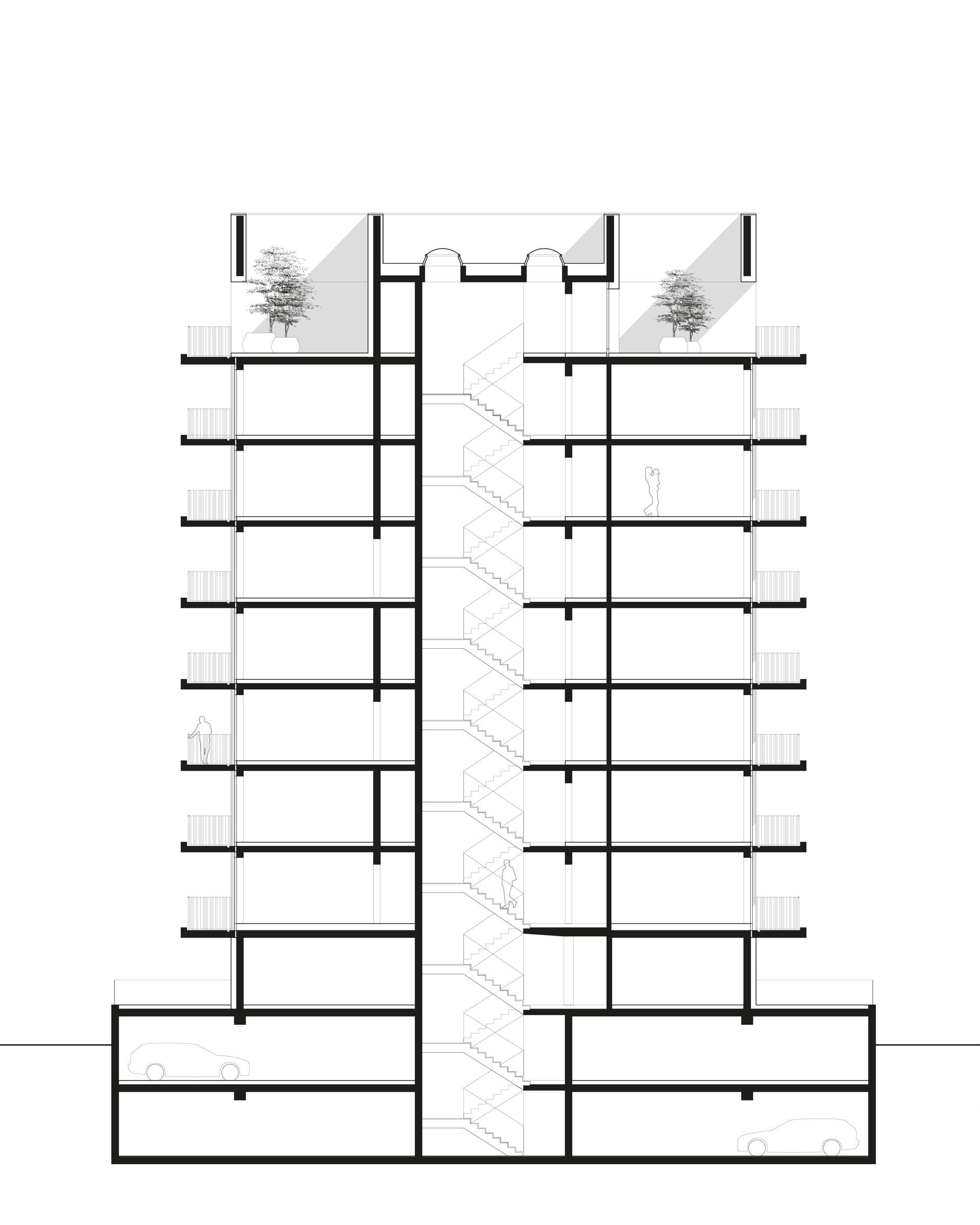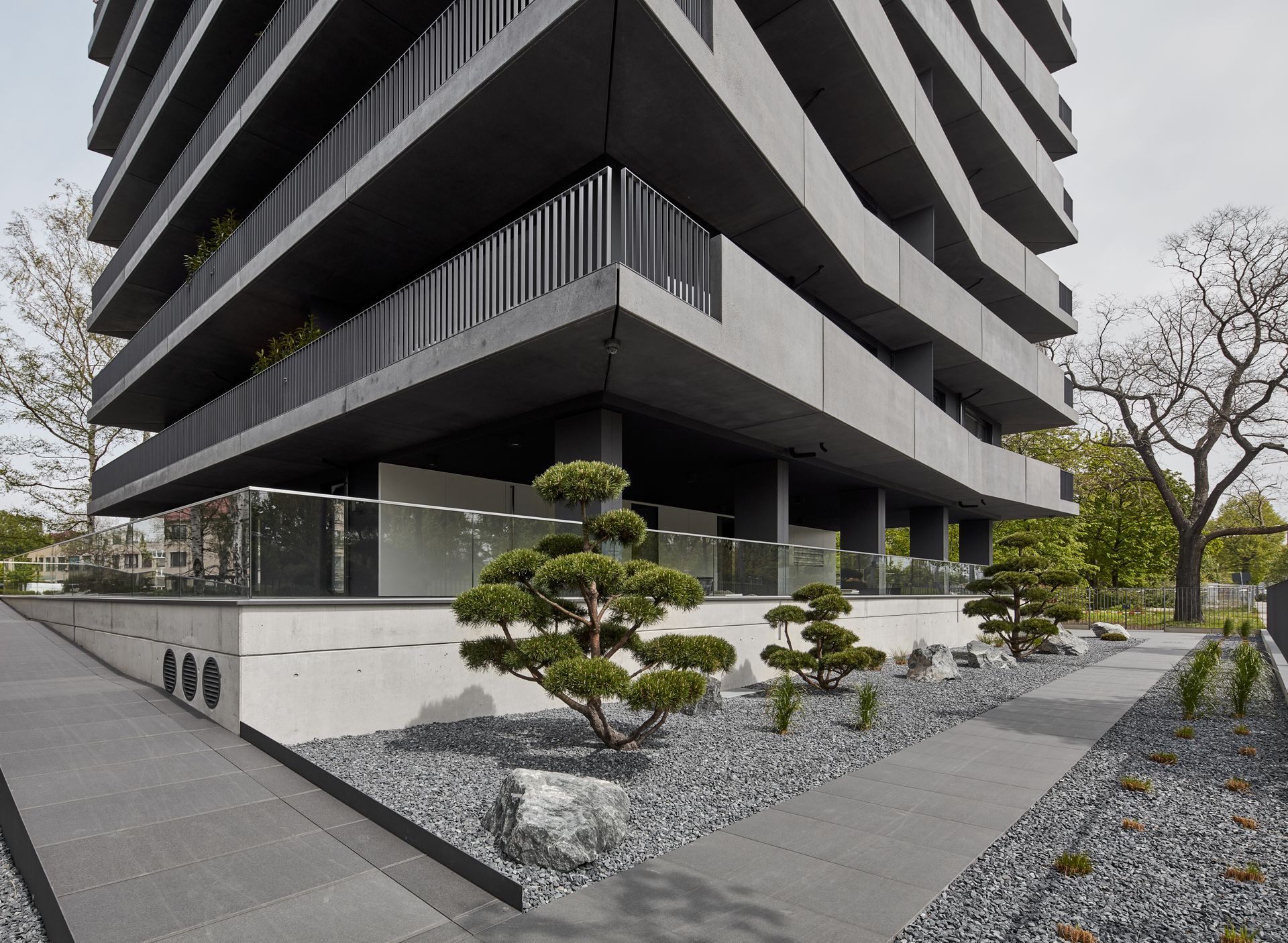Der 2017 fertiggestellte Wohnsolitär von LeinertLorenz Architekten spricht eine klare Materialsprache aus Beton und Stahl. Der Solitär erhebt sich markant in eine Höhe von 27 Metern und ist somit eine Seltenheit in der neuen Dresdner Stadtgeschichte. In der von Grün durchzogenen Gegend setzt sich der Neubau klar ab und ergänzt die umliegende Szenerie um einen zusätzlichen, individuellen Stadt-baustein, der vielleicht erst auf den zweiten Blick seinen ganzen Charme entfaltet. Ebenso großzügig wie den Charakter des Gebäudes prägend, sind die überkragenden Balkone - auf der adressbildenden Seite und ihrem Gegenüber mit schützenden Betonbrüstungen, auf den verbleibenden zwei Seiten mit Stahl-geländer gestaltet. Durch die etagenweise vorgenommene Verschiebung der Knicke und Falze entfalten die Balkonbänder ein fließendes perspektivisches Spiel und die Konstruktion erhält eine dem Beton sonst nur schwer zu entlockende, fast tänzerische Dynamik.Das Material wurde im Großen und im Kleinen gestaltet. In erster Linie ist die Fassade natürlich mit Knicken und Versprüngen wahrnehmbar. Jedes einzelne Bauteil erhielt aber auch unterschiediedliche Oberflächenveredlungen wie sehr glatt und gesäuert.